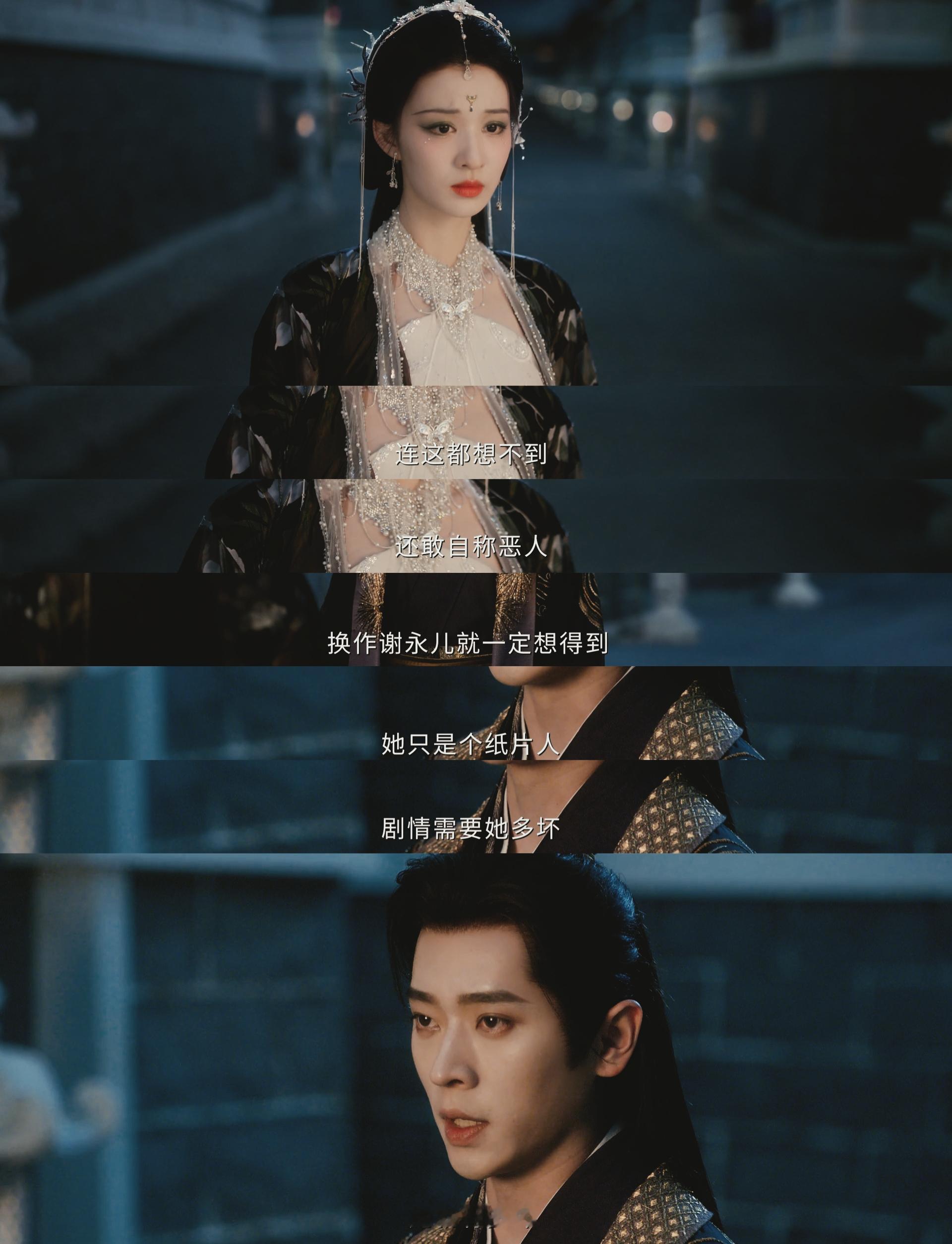 在遇到庾晚音之前的夏侯澹早已沦为了另一种意义上的“纸片人”。当夏侯澹给出“让一个人活着,有很多种方式”的答案后,我窥见了那个习惯以恶示人的夏侯澹,藏在狠戾之下的,是对“恶”最清醒的认知。谢永儿的恶是原作的工具人属性,而他的恶,是在绝境里为了活下去,主动选择的“生存策略”。“剧情需要ta多坏,ta就有多坏”,这个ta,是谢永儿,也是身心皆不由己了多年的夏侯澹。感觉连夏侯澹都接受不了自己这么多年的作为,更难想象庾晚音知道这一切后又该有多痛苦了。