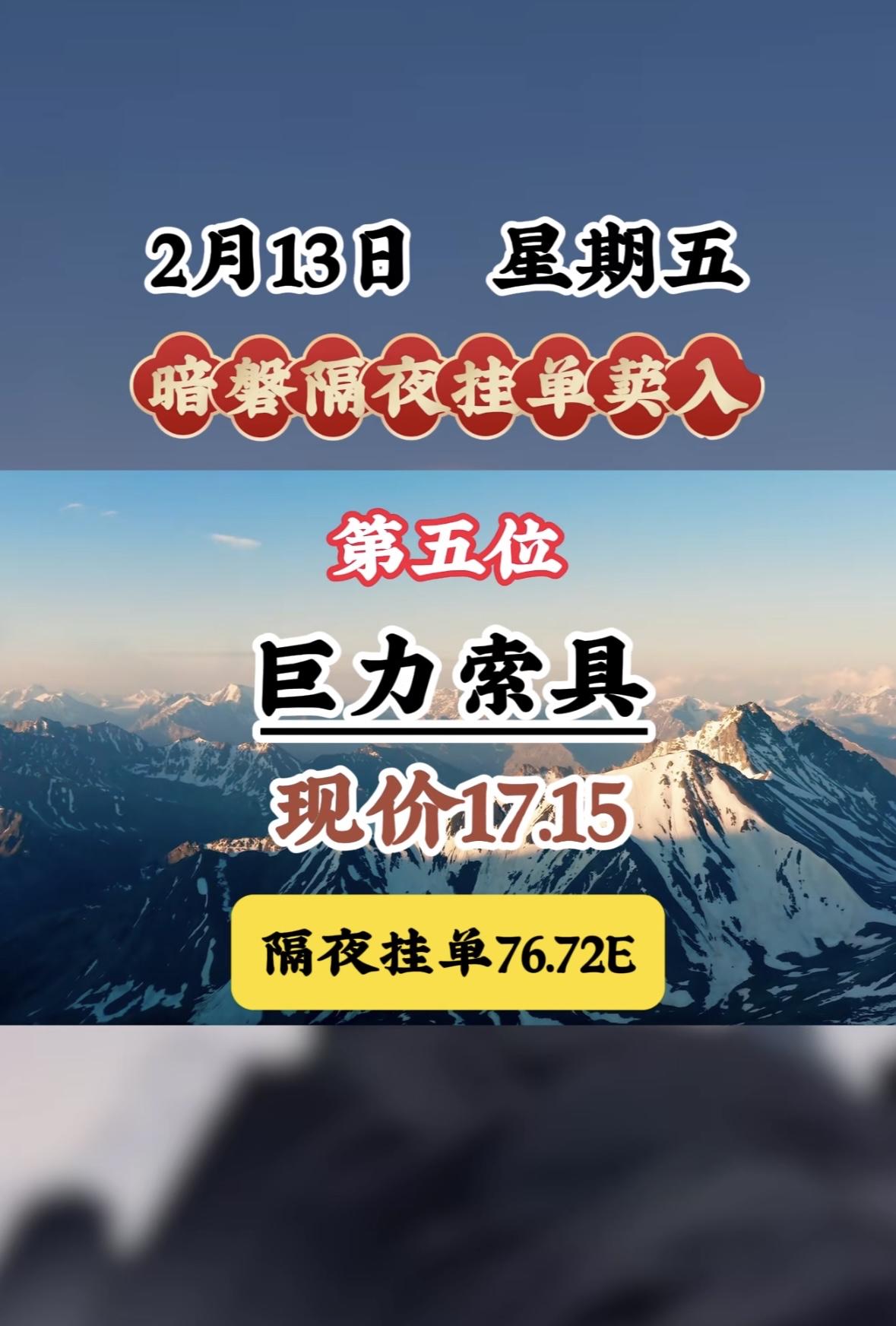2月13日巨力索具现价17.15,暗盘隔夜挂单76.72E,星期五推荐! 2月
