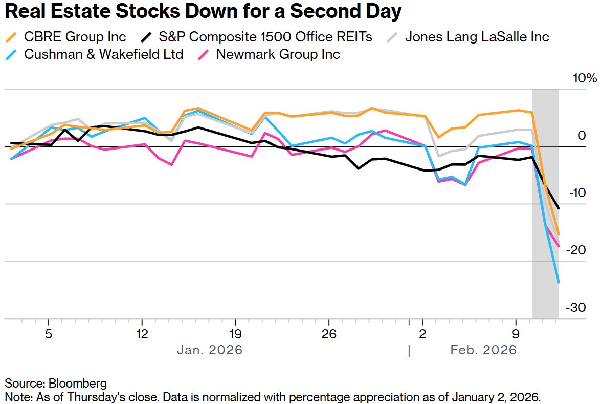 智通财经注意到,由于交易员担心人工智能工具更广泛的使用可能冲击写字楼需求,商业地产股周四暴跌,使始于周三的市场局部抛售进一步蔓延。