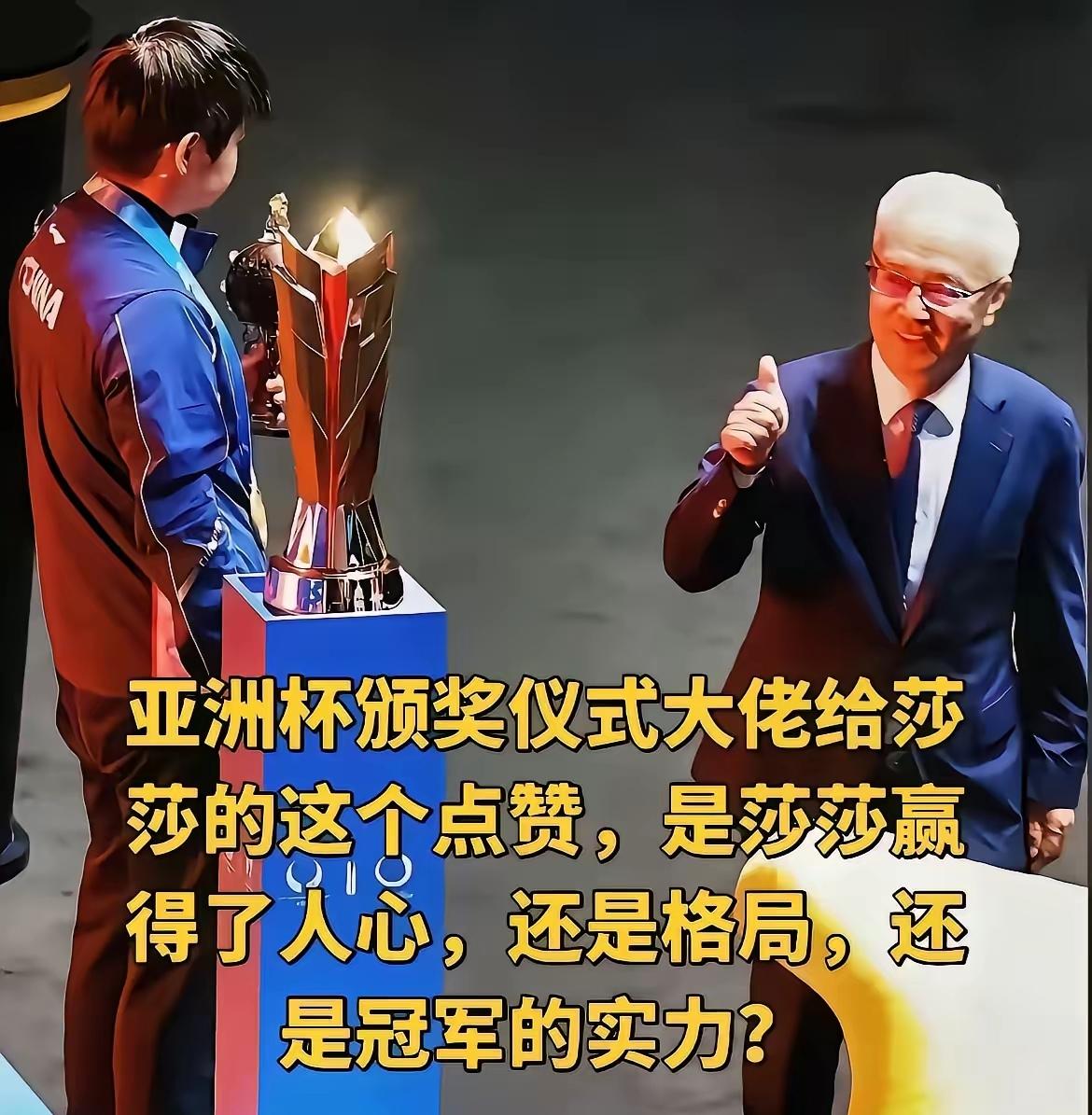 两届亚洲杯,偏爱总是孙颖莎? 得冠军被偏爱 没得冠军同样被赞美, 为什么?凭什么? 2025亚洲杯,莎莎得亚军, 崔局长专程走向她, 亲切唤名握手; 2026年白发颁奖嘉宾无视流程,只为她竖起大拇指。 这难道是偶然? 赢也最强,输也最棒, 莎莎凭什么征服了人心赛场: 每球必争、逆风不怂、 拼到最后一刻, 让人佩服的五体投地。 技术过硬、心态沉稳、 用实力赢得全场敬畏 让全场真心折服, 胜不骄败不馁尊重对手善待队友 这样的大格局引人赞赏, 永远阳光坦荡、从不张扬、 低调又努力, 让人无法抗拒的由衷喜爱。 无关名次, 只关人品与风骨, 这样的孙颖莎, 值得所有例外与偏爱。
