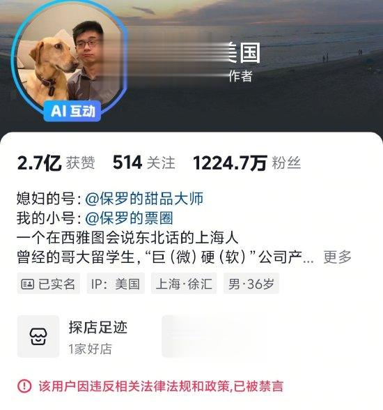 目前,“保罗在美国”被平台正式禁言,账号主页显示“该用户因违反相关法律法规和政策,已被禁言”。