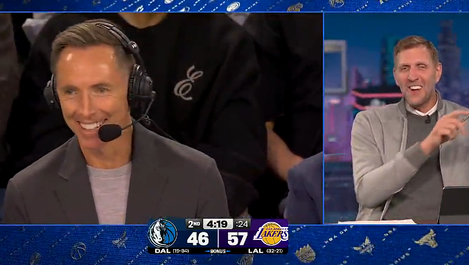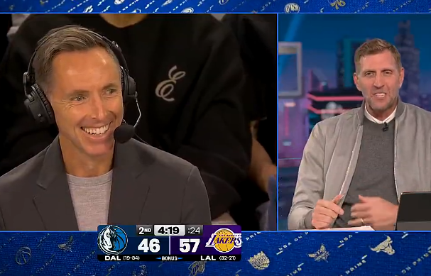 乐开花!湖人和独行侠比赛,诺维茨基和纳什连线互开玩笑