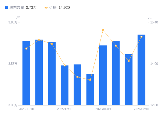 日期A股户数(户)流通A股户均持股数(股)户均持股市值(万元)2026-02-10372686884.4410.272026-01-30360927108.7610.022026-01-20368736958.1910.172026-01-09366197006.4610.612025-12-31348887354.099.902025-12-19354747232.609.812025-12-10354087246.0910.112025-11-28368336965.7510.232025-11-20369676940.5010.292025-11-10368836956.3010.10