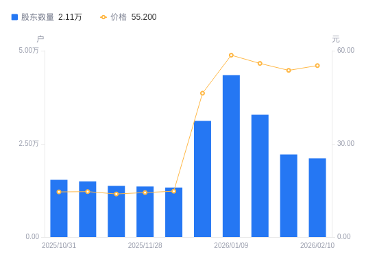 日期A股户数(户)流通A股户均持股数(股)户均持股市值(万元)2026-02-10210937958.8343.932026-01-30221377583.4940.702026-01-20328205115.0428.592026-01-09434303865.4322.632025-12-31311665386.5024.942025-12-101329112630.7818.632025-11-281355712382.9517.732025-11-201372712229.6016.952025-11-101491311257.0016.462025-10-311536110928.6915.88