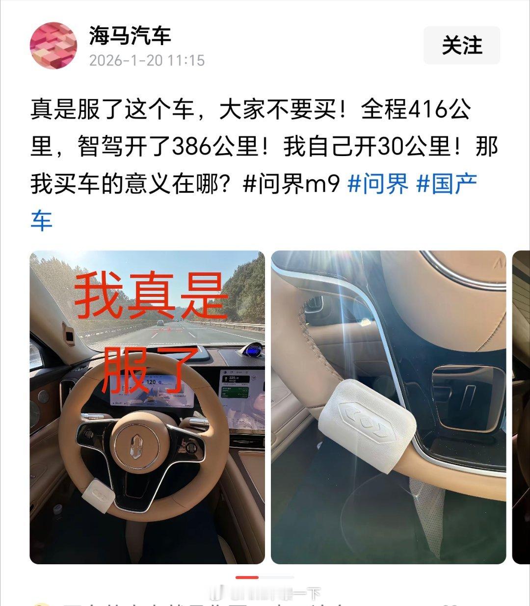请某些车主不要再到处宣传这种行为了,我也是鸿蒙智行车主,但我开智驾从来不会大撒把,始终把持至少一只手搭在方向盘上,诚然华为乾崑智驾很厉害,但现阶段各家水平参差不齐,道路安全缺乏一个整体的智驾标准,还是需要人车共驾的!
