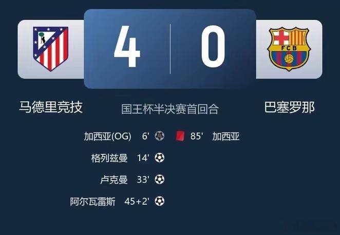 西蒙尼的帅位已经焊死,老子爆的就是精锐,上次打皇马进5个,这次打巴萨一样能进4个,国王杯半决赛首回合马竞在利雅得航空大都会球场4:0巴塞罗那,马竞进攻行云流水,缺少拉菲的巴萨浑浑噩噩,马竞这攻击线竟然能进4个,得证明巴萨的后防有多烂啊,在看看马竞这后防,亚马尔领衔的攻击线竟然一个球都进不了,基本可以判定巴萨出局了,次回合在诺坎普晋级的概率已经不足1%。