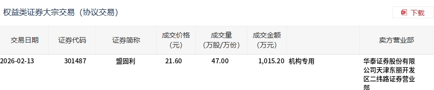 2月13日,盟固利大宗交易成交47万股,成交额1015.2万元,占当日总成交额的2.91%,成交价21.6元,较市场收盘价23.92元折价9.7%。