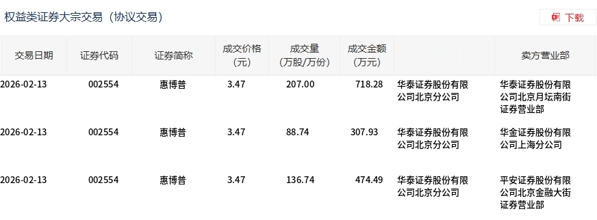 2月13日,惠博普大宗交易成交432.48万股,成交额1500.7万元,占当日总成交额的7.71%,成交价3.47元,较市场收盘价3.8元折价8.68%。