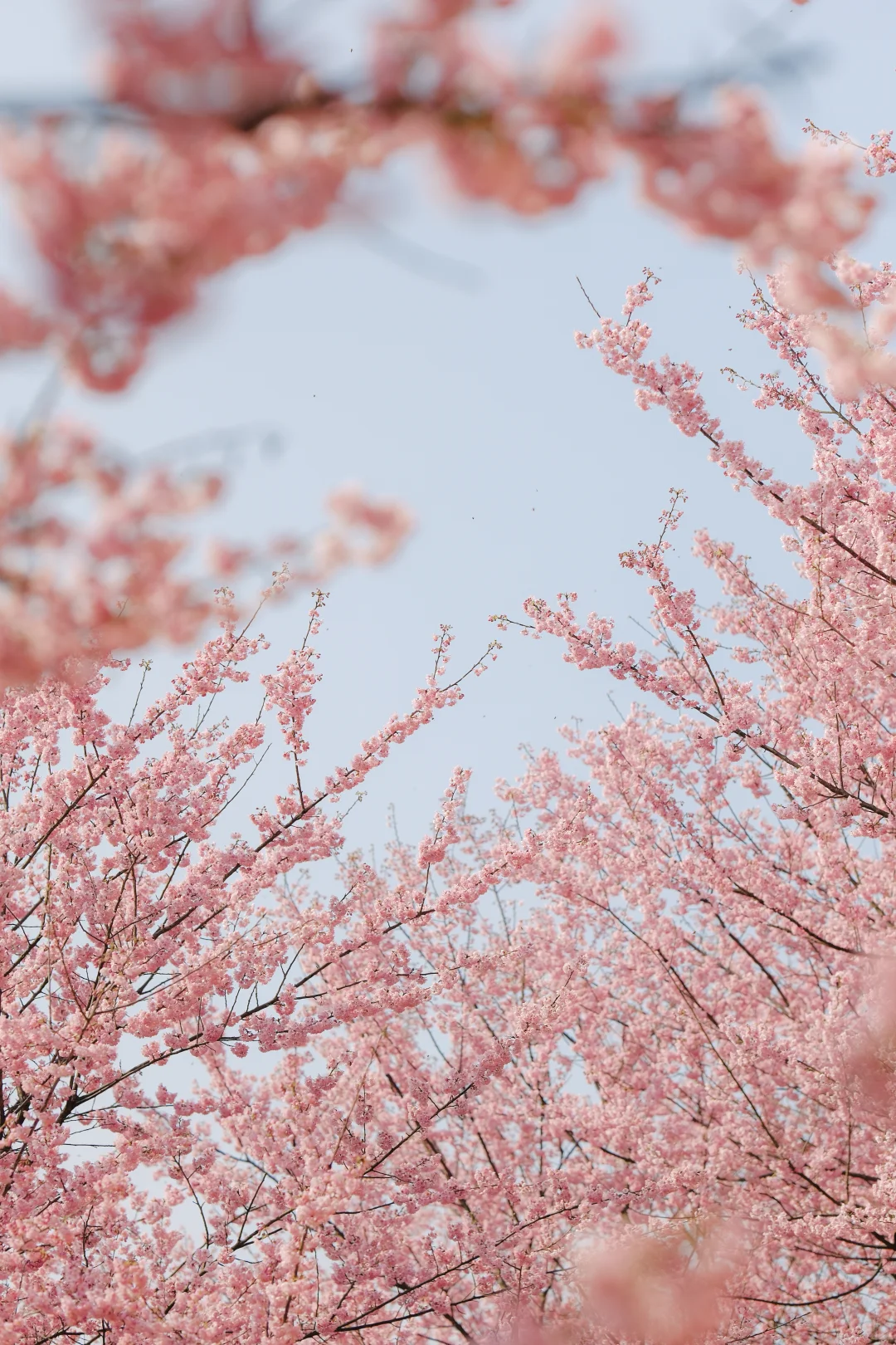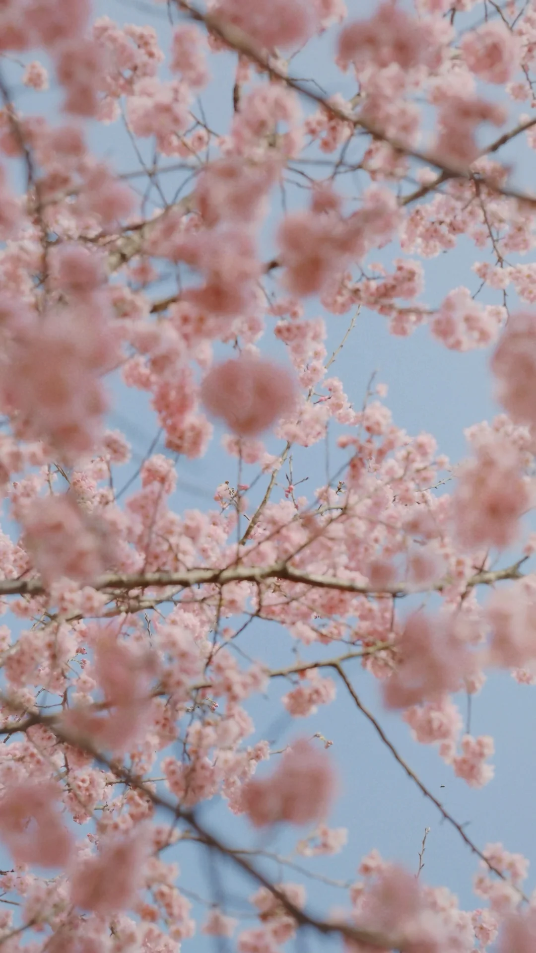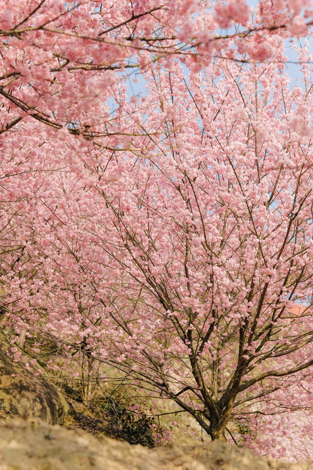 3️⃣去找山坡上种满樱花的位置,站在樱花树下,背景里就是很好看的樱花树梢与天空,而且看不太到太多树干,画面会很干净
