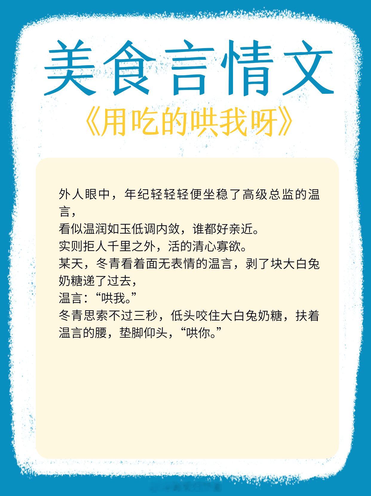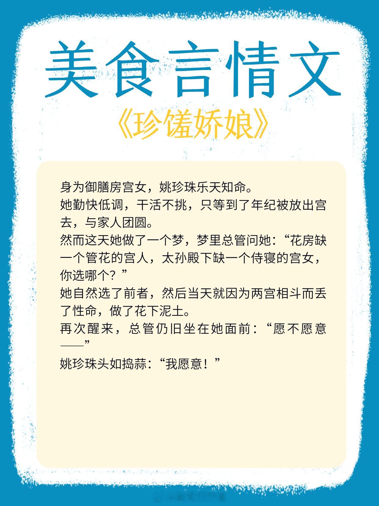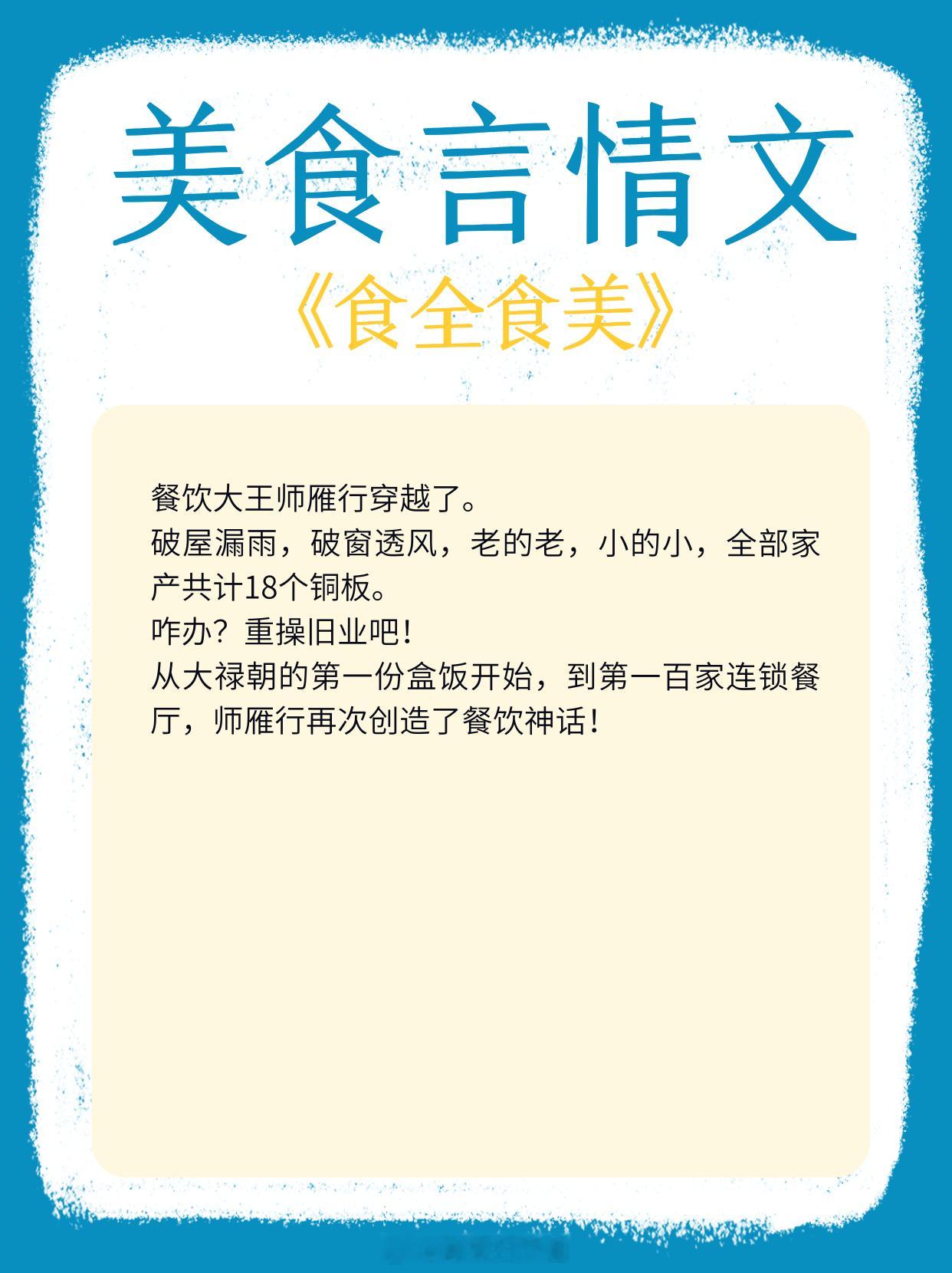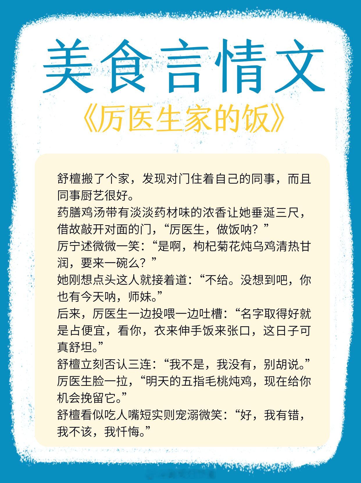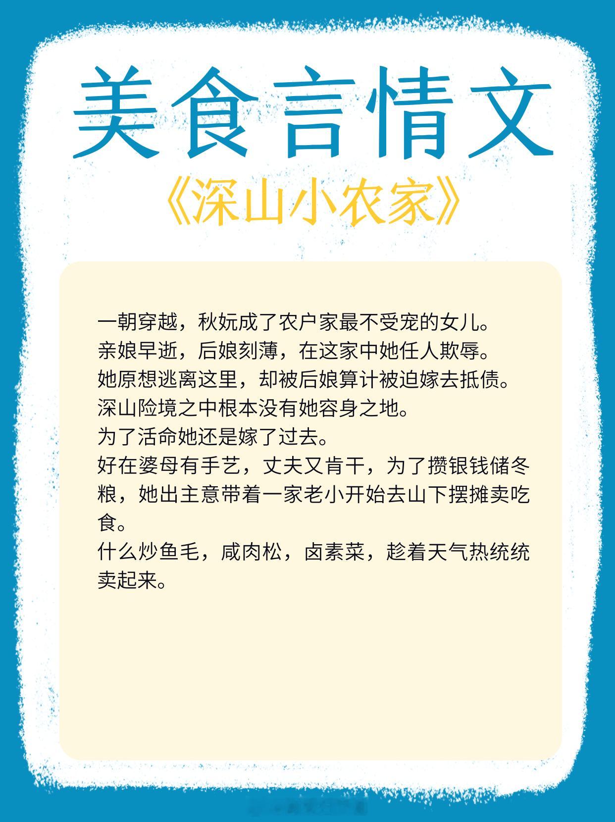 美食言情文,吃吃喝喝,人间烟火!平平淡淡,甜蜜美好!章章美食,流口水警告!!1.《废太子的早死原配》 作者:吾彩2.《蓦然》 作者:云静渚3.《深山小农家》 作者:申行4.《用吃的哄我呀》 作者:卿白衣5.《食全食美》 作者:少地瓜6.《情郎是皇帝》 作者:碧云天7.《厉医生家的饭》 作者:山有嘉卉8.《傻瓜镇的居民》 作者:樱桃煎9.《珍馐娇娘》 作者:鹊上心头这小说写在我心趴上了 兜兜转转还是这些小说好看
