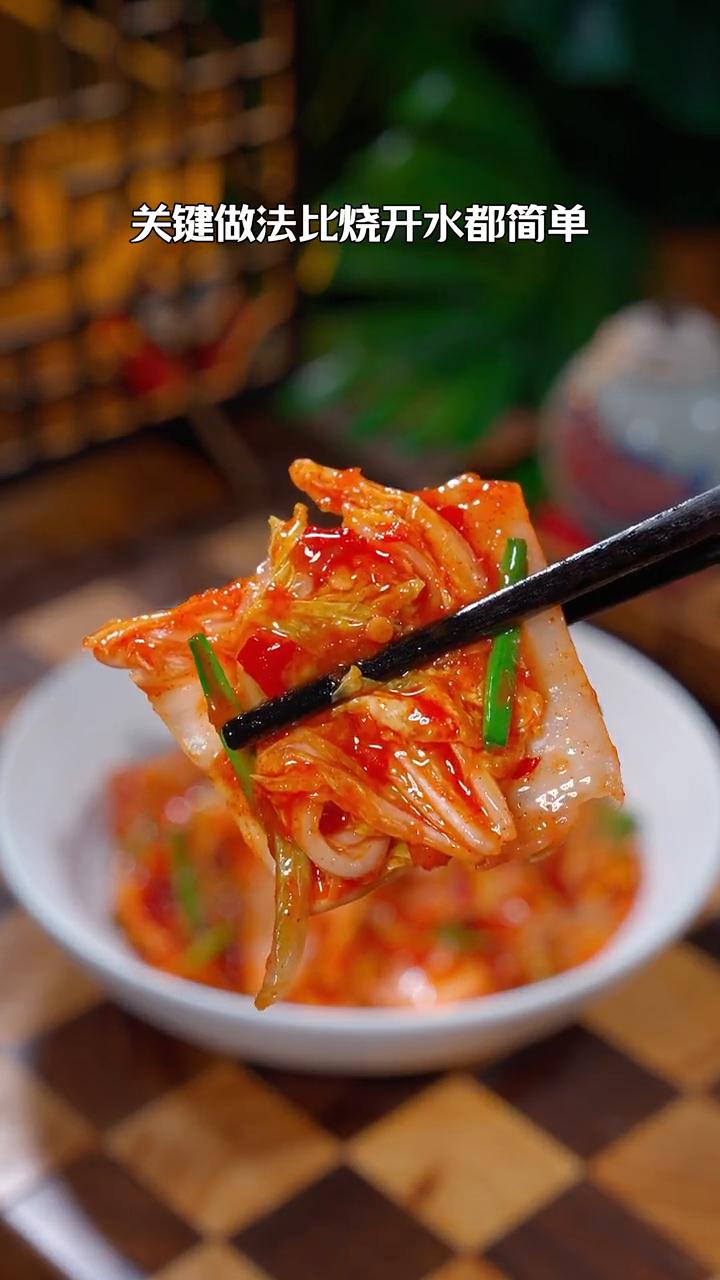 辣白菜。 我告诉你,很多人都不知道白菜除了炒着吃、炖着吃,还可以像我这样做,口感清脆,酸爽又过瘾,不管搭配米饭还是烤肉都非常好吃,关键做法比烧开水都简单。 ·6分钱一斤的白菜用手掰成4瓣,再撕成长长的小条,撒上一把食用盐,用右手抓拌均匀,腌制半个小时,杀出白菜多余的水分。 ·再加入适量清水,洗去白菜表面的盐分,控干水分,放入盆中,再放一把韭菜段。 ·调味我们家常用这款浩七七家的辣白菜酱,它的味道都是朝鲜族大厨按比例调制好的,里面还添加了新鲜的苹果梨,只用放一袋,其他什么都不用加了,抓拌均匀,腌制两小时就可以开吃了。 这样做的辣白菜酸酸甜甜微微辣,搭配烧烤和米饭真的是太好吃了。