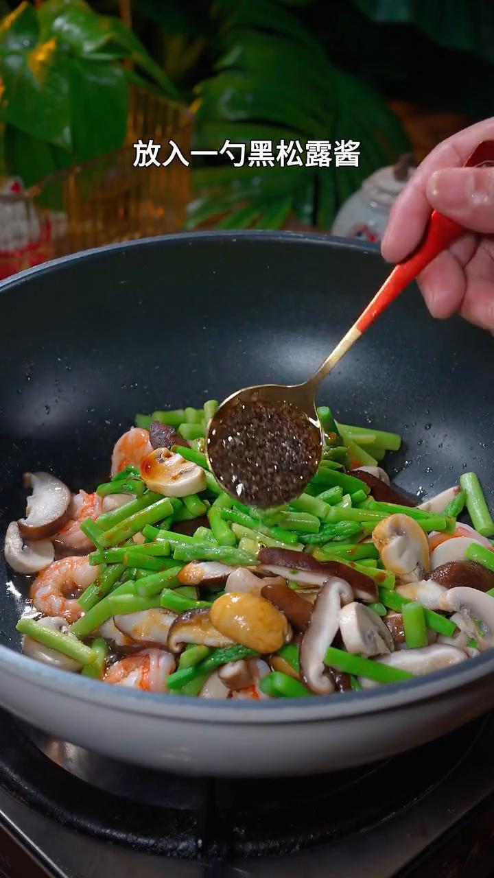 黑松露菌菇虾仁。 当前正是菌菇最鲜美好吃的季节,所以我每周都会给孩子做3次黑松露菌菇芦笋虾仁,鲜香味美还营养,孩子说比星级餐厅做的都好吃。 ·首先水开放一勺盐和少许食用油,下入切好的芦笋和切好的菌菇,焯水2分钟后捞出备用。 ·油热下入虾仁,把虾仁炒至变色,再倒入菌菇和芦笋,淋入一勺生抽,放入一勺黑松露酱,最后用大火翻炒均匀即可。 一出锅满屋飘香,q弹的虾仁搭配上芦笋口蘑真的是鲜上加鲜,快给你家孩子也做起来吧!