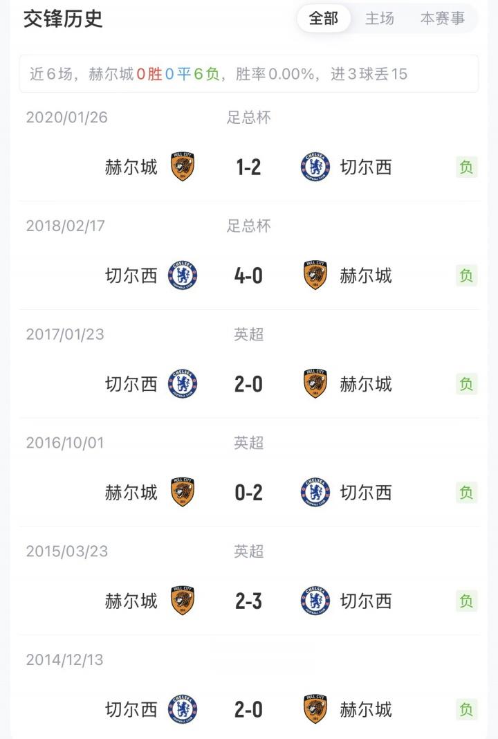 切尔西在足总杯中与赫尔城交手8次全部晋级,35次对阵26胜8平1负。