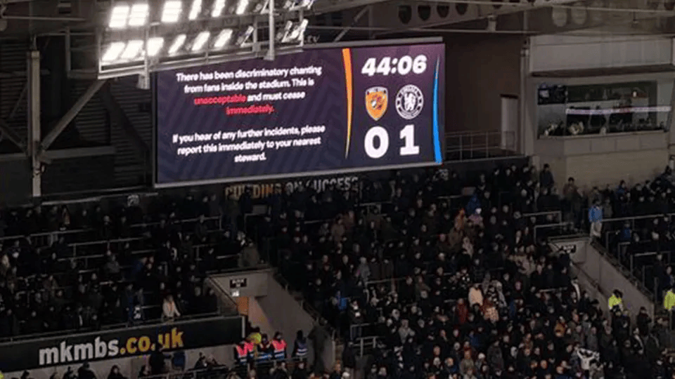 屏幕上显示的信息是:“体育场内有人发出歧视性口号。这种行为令人无法接受,必须立即停止。