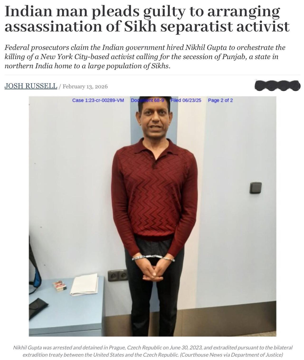 莫老仙领导的印度 老觉得自己是以色列 ,认为其有能力清除分离分子,结果在行动中又出丑了。 2月14日,美国司法部表示,“印度国民尼基尔·古普塔受一名印度政府雇员指使(未遂刺杀事件发生在2023年),策划了针对美国锡克族分离主义运动领袖古尔帕特旺特·辛格·潘农的谋杀行动”,古普塔随后认罪。 印度胆子也是够大,连在美国本土搞暗杀这种事儿都敢干。凶手人没杀成,倒把自己送上了法庭,还让印度在全世界面前丢了脸。 印度这是真把自己当摩萨德了,可干出来的事儿却像三流特工电影,不光没办成事,还惹了一身骚,现在这名行凶者被关在美国,成了美国手里一张牌,想啥时候打就啥时候打,印度现在只有被拿捏的份。