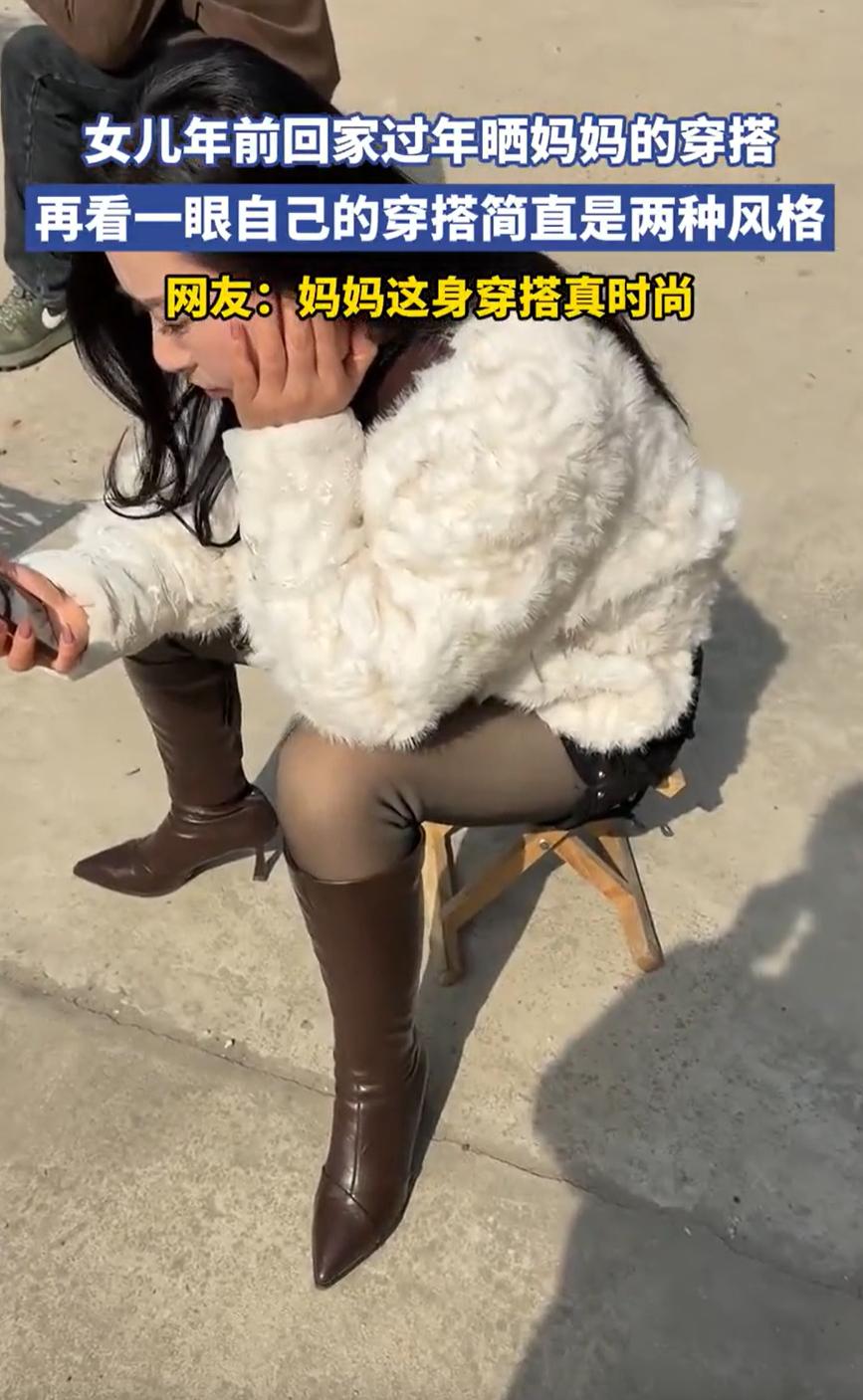 笑不活了!安徽,一女生春节回家过年,可到家后却发现妈妈打扮的相当洋气,短裙丝袜穿在身上,反观自己穿着个阔腿裤,大半的相当老气,女子:一时间分不清谁才是年轻人! 从女生分享的视频来看,妈妈的整体穿搭也是用心了,穿得洋气得跟个时尚博主似的,毛绒的白色外套,长睫毛,大波浪,短裙丝袜配上长筒靴,往那一坐反倒与周围的环境有些格格不入 再看看自己,厚厚的羽绒服,宽松的阔腿裤,裹得严严实实,整个人圆滚滚的,连体重都藏得让人猜不出来,让人猜体重都没法猜,女生也是调侃,自己和母亲完全就是两种风格 视频传到网上,评论区一下子热闹起来。有人说,这妈妈活明白了,日子过给自己看,管别人怎么想。也有人感叹,自己回家三天就被嫌弃,人家妈妈却成了全村最靓的风景 其实细想想这也不是什么稀奇事,看妈妈的模样也就是40岁左右,这一代中年女性,跟咱们印象里的妈妈辈已经完全不是一回事了。她们年轻的时候甚至还经历过非主流时期,这可是一代人的回忆,所以这么打扮也不奇怪 过年回家,看到妈妈打扮得漂漂亮亮,其实是件让人高兴的事。这说明她心情好,身体好,愿意花时间在自己身上。做儿女的,嘴上调侃几句,心里多半是欣慰的 至于谁更像年轻人,这种比较本来就没意思。年龄不过是个数字,心态年轻才是真正的年轻。妈妈穿短裙也好,姑娘穿羽绒服也好,只要自己开心,怎么都行