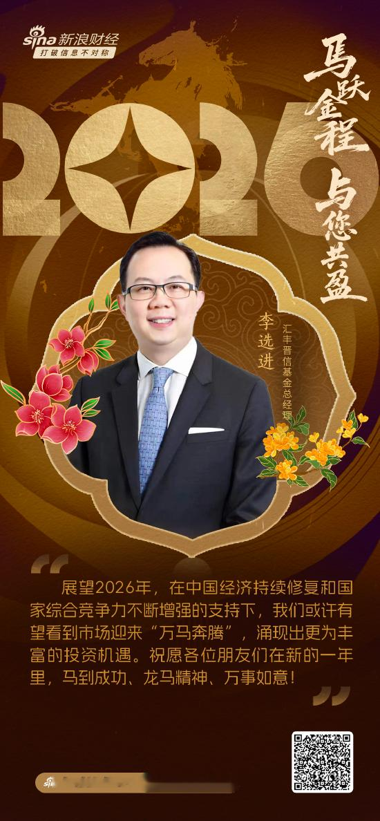 汇丰晋信基金总经理李选进送来新春祝福。他表示,展望2026年,在中国经济持续修复和国家综合竞争力不断增强的支持下,我们或许有望看到市场迎来“万马奔腾”,涌现出更为丰富的投资机遇。汇丰晋信基金也将始终秉持“长期投资,汇见未来”的理念,不断升级投研体系,为广大投资者提供更为丰富的资产配置解决方案。祝愿各位投资者朋友们在新的一年里,马到成功、龙马精神、阖家幸福、万事如意!