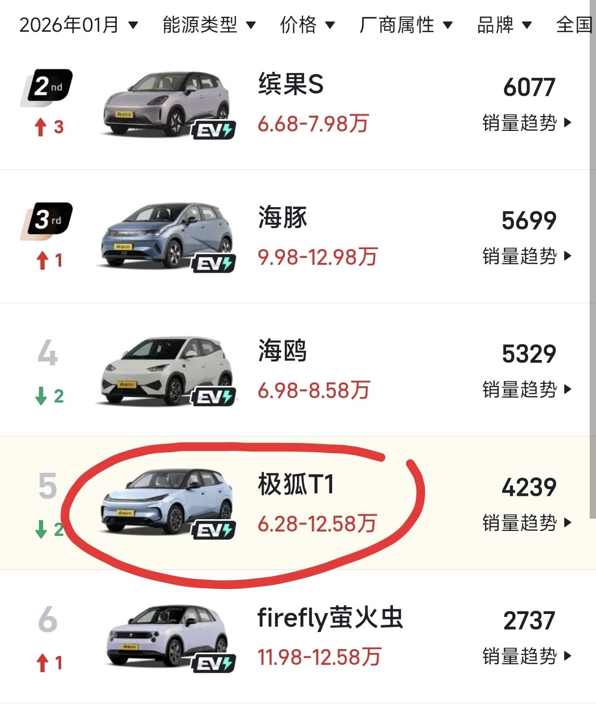 极狐T1,销量掉的有点厉害啊! 2026年1月份,极狐T1卖了4239辆,相对于2025年12月的17170辆,11月的14162辆,10月份的15050辆,销量跌去了7成,这个幅度有点过大了。 2026年,因为购置税的原因,很多车企的销量都有所收窄,整个行业都进入了一个下跌期。 极狐T1是一款性价比超级高的车型,同级别最长的车身,最大的轴距,6.98万,能买到一款续航425公里的纯电车,市面上小型车,真没有一个打得过它。 最大的竞争对手,名爵MG4,1月份卖了10006辆,销量十分稳定。 极狐T1,这么大的销量震幅,除了购置税的缘故,还有其他什么原因吗?
