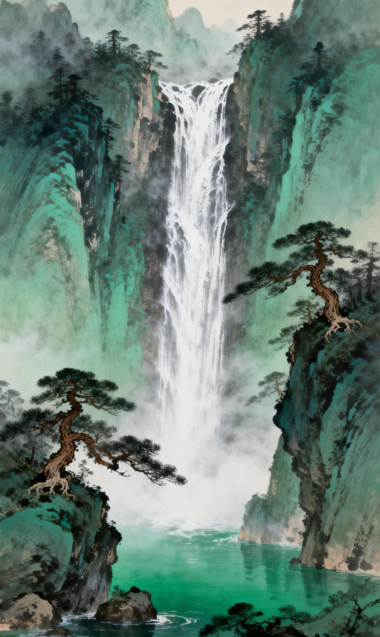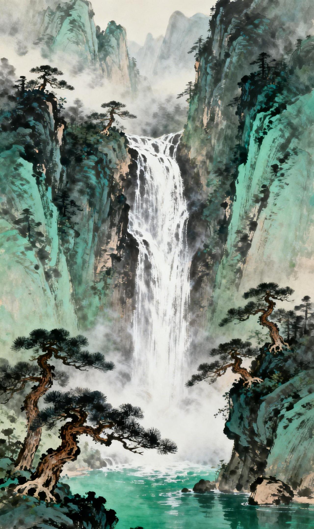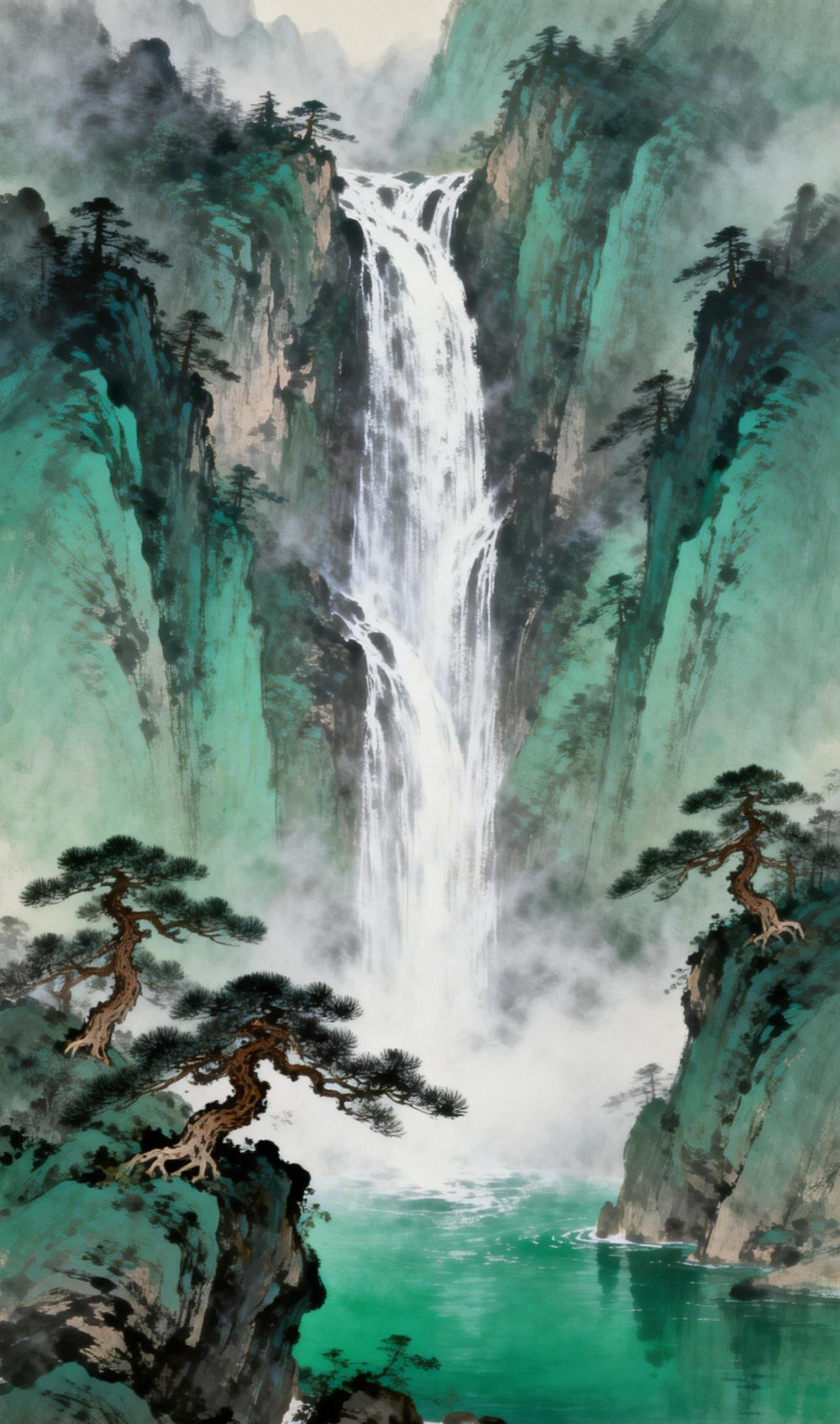 青峦悬练 青峦叠嶂,一练飞悬。碧瀑自云间垂落,击石生雾,碎玉迸溅如星。峭壁古松虬枝斜出,针叶曳风,似笔锋扫过淡霭,在湿润的空气中划开细微光痕。 雾起幽谷,舒卷如纱,时而半掩峰棱,时而轻缠松腰。山影与水色在朦胧间交融,浓淡参差,晕染出一卷流动的青绿。深潭承瀑,涟漪澹荡,水纹与雾痕低语,清响同幽光共颤。霎时间,天地止息,唯见水烟漫过千岩,松涛拂过万壑,空濛中自生意境悠长。 古风