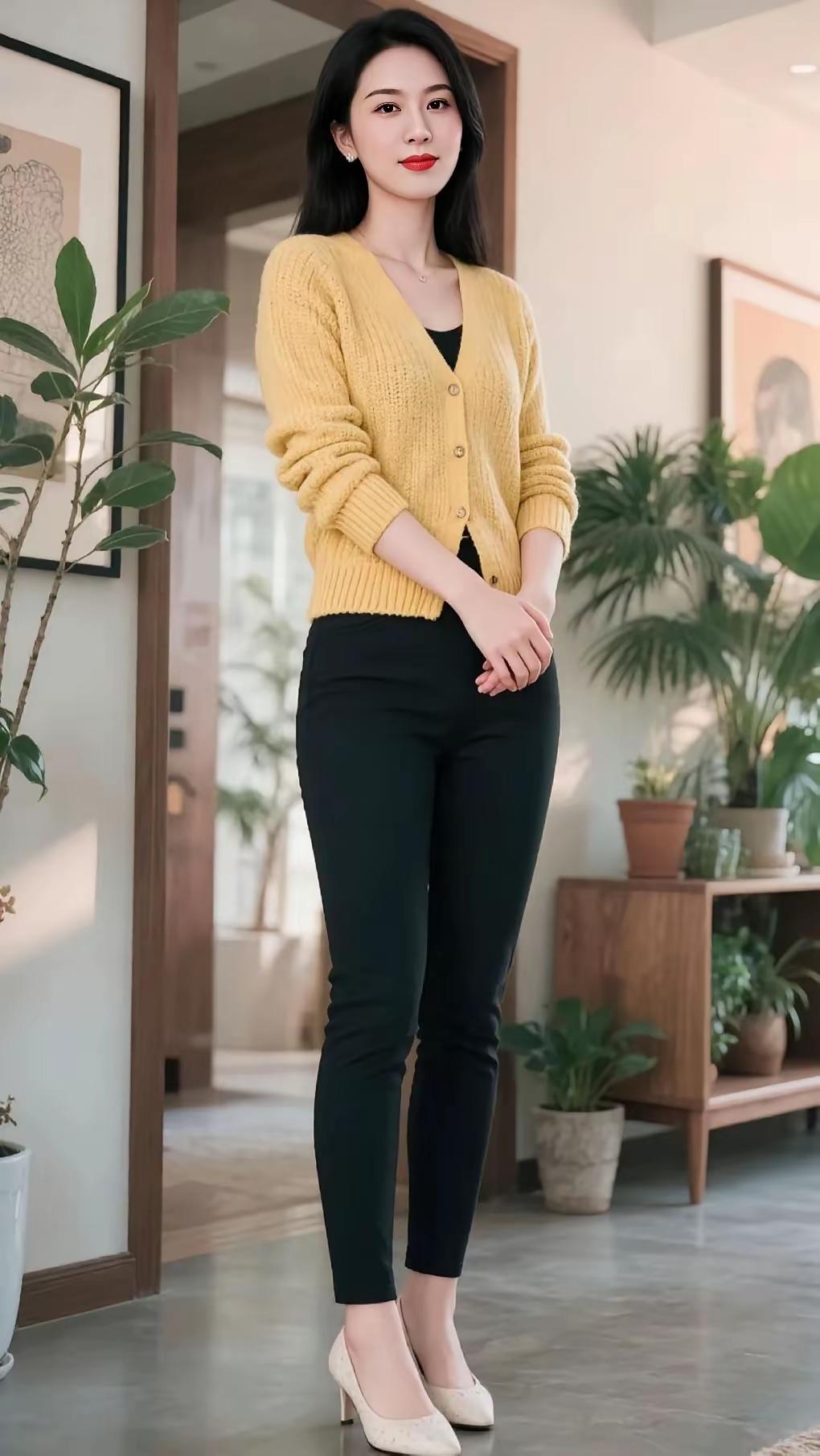 优雅穿搭指南:黄色毛衣+黑色紧身裤,简约而不失时尚!