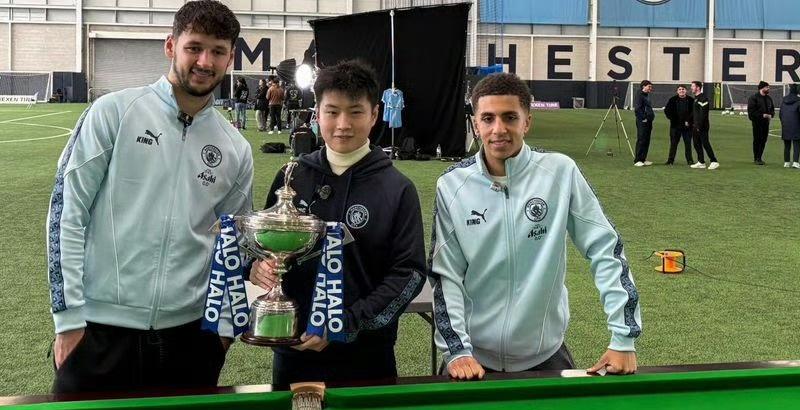 WST报道,斯诺克世界冠军赵心童近日到访曼城足球俱乐部,与里科·刘易斯和詹姆斯·特拉福德会面,并在标准斯诺克球台上向两位球员传授了些许技巧 自孙继海于21世纪初效力曼城以来,众多中国足球迷——包括赵心童本人,便一直支持这支球队。这位新科世界冠军受俱乐部邀请,在阿提哈德球场观看了曼城对阵勒沃库森的欧冠比赛,次日又前往球队训练基地参与内容拍摄活动 赵心童在绿茵般的台呢上向后卫刘易斯和门将特拉福德展示了斯诺克技艺 赵心童表示:"现场观赛并亲自指导两位球员打斯诺克的经历实在太美妙了。球场氛围无与伦比,这是我第一次现场观看曼城比赛,必将成为珍贵记忆。幼时我常与父母通过电视观看足球,正因为孙继海的效力,我们开始关注曼城。如今能亲临现场并与球员见面,堪称梦幻。" 特拉福德赞叹道:"亲眼目睹赵心童展现精湛球技令人惊叹,他的天赋超凡绝伦。现在他是我最喜爱的斯诺克选手!"(世界斯诺克巡回赛)