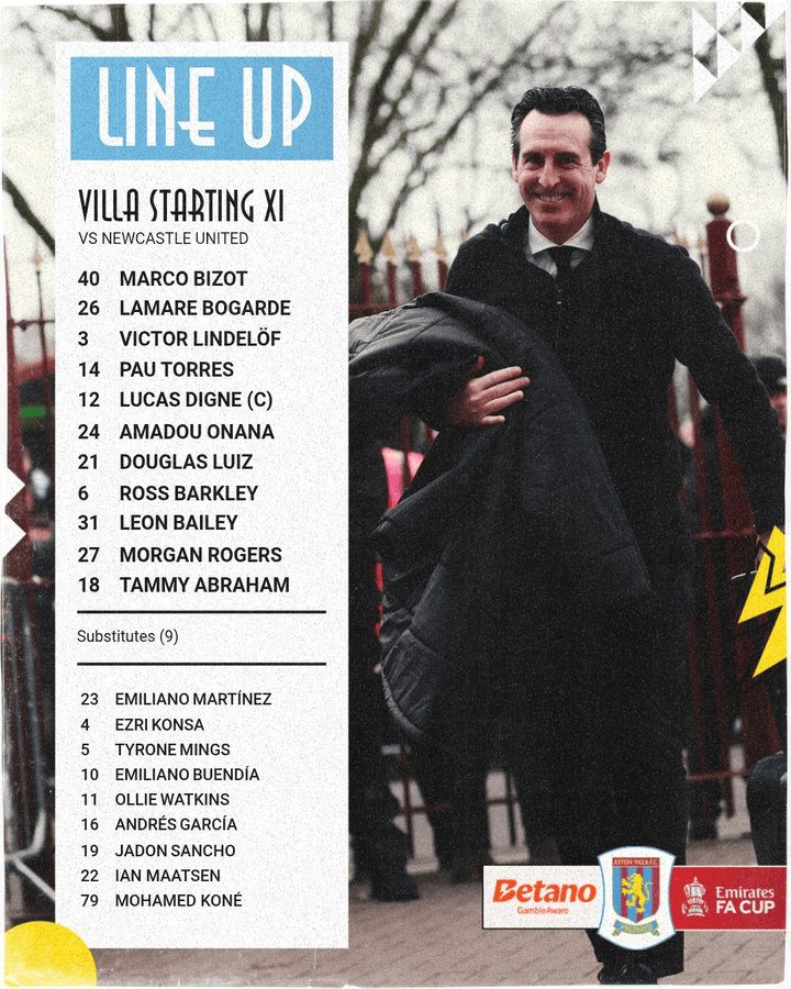 虎扑02月15日讯足总杯第四轮,维拉主场迎战纽卡斯尔的比赛即将开球,赛前,双方公布了本场比赛首发名单。