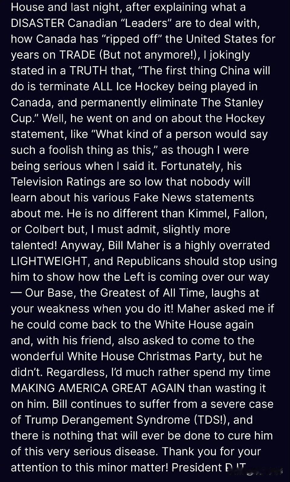 情人节一大早,特朗普发长文炮轰Bill Maher: “有时候人生就是会白白浪费时间! 电视主持人 Bill Maher 通过他的一位朋友——那人也是我的朋友——提出想跟我共进晚餐,我答应了。他走进著名的椭圆办公室时,跟我原本想象的完全不一样。他紧张得要命,毫无自信。为了让自己镇定下来,几乎刚坐下几秒钟就点了一杯“Vodka Tonic”。他对我说:“我从没这样过,我真的有点害怕。”某种程度上,还挺让人觉得可爱的。 总之,我们那顿晚餐很愉快,节奏很快,很轻松。他看起来是个不错的人。而且在我们见面之后的第一期节目里,他对这次会面还挺客气的——不过想想也正常,在我把国家从“毁灭边缘”拉回来之后,他还能不客气吗? 可没过多久,我就发现他的节目又变回老一套——无聊透顶,反川普。完全不提所谓“完美的边境”、125年来最低犯罪率、大规模驱逐铁面无情的罪犯、道指5万点、标普7000点(全都创历史新高!)、1900年以来最低谋杀率、委内瑞拉、“午夜重锤行动”、Soleimani被击毙、al-Baghdadi被击毙、近几年最低通胀(过去三个月只有1.2%!)、重建军队、八场战争停火……说不完! 不管怎样,让这个家伙进白宫对我来说完全是浪费时间。昨晚我谈到加拿大那些“领导人”有多难打交道,说加拿大这些年在贸易上如何“占美国便宜”(不过现在不会了!)时,我在 TRUTH 上开了个玩笑,说:“中国要做的第一件事,就是终止加拿大所有冰球比赛,永远取消Stanley Cup。”结果他抓着这句玩笑话不放,反复念叨:“什么人会说出这么愚蠢的话?”好像我是认真的一样。 好在他现在的收视率低到不行,估计也没几个人会听到他那些关于我的“假新闻”。他跟 Jimmy Kimmel、Jimmy Fallon、Stephen Colbert 没什么两样——不过我得承认,他多少还是比他们有点才华。 总而言之,Bill Maher就是个被严重高估的轻量级人物。共和党人也别再拿他当例子,说什么“左派正在转向我们这边”——我们的基本盘,史上最伟大的那群人,只会笑你们太软弱。 他后来还问我能不能再来一次白宫,还通过那位朋友想参加精彩的白宫圣诞派对,不过最后没来。说到底,我宁愿把时间花在“让美国再次伟大”上,也不想浪费在他身上。 Bill 依然深陷严重的“Trump Derangement Syndrome(TDS)”,这病恐怕是无药可医了。