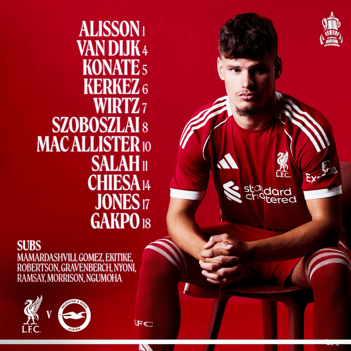 虎扑02月15日讯足总杯第四轮,利物浦主场迎战布莱顿,赛前,双方公布了本场比赛首发名单。
