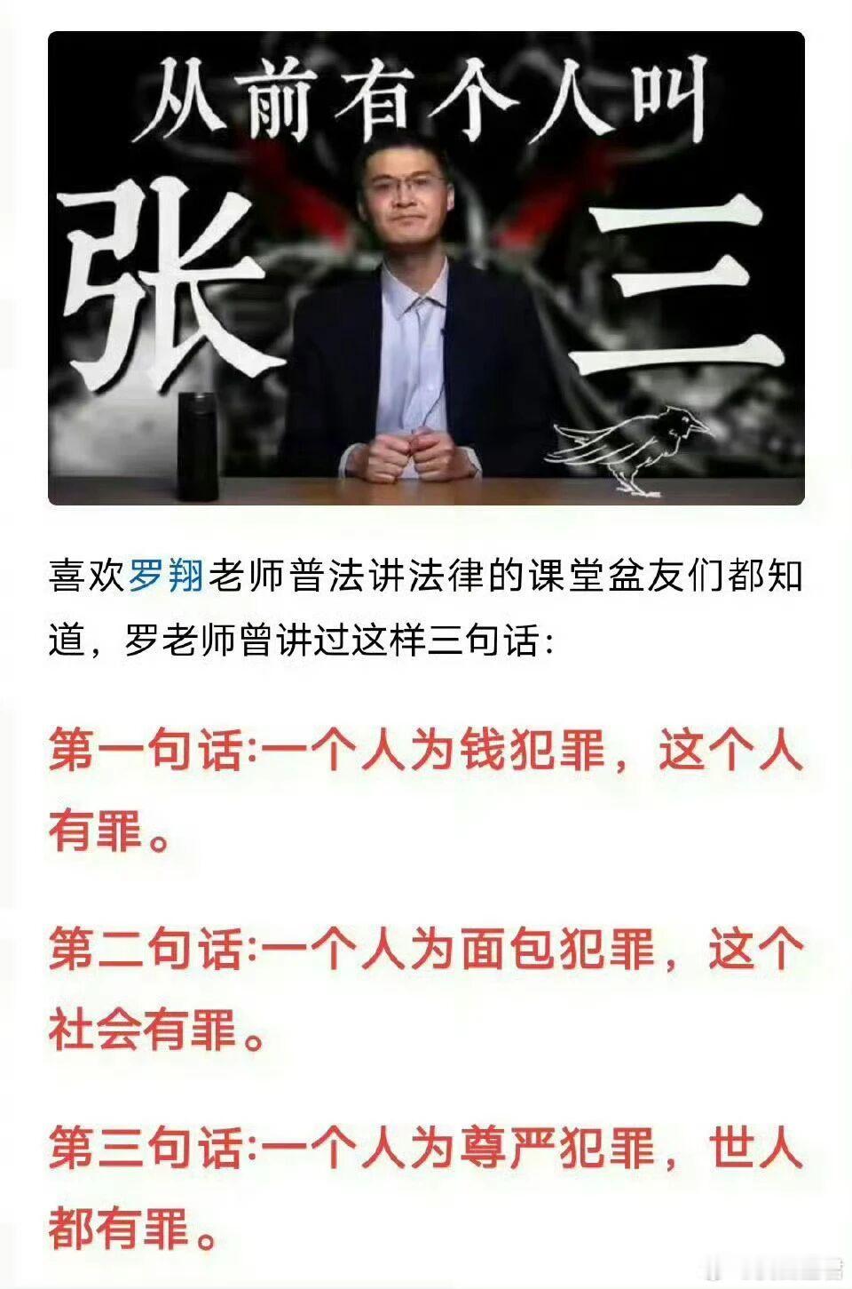 有人总结了罗翔说过的三句话。第一句话是“一个人为钱犯罪,这个人有罪”;第二句话是“一个人为面包犯罪,这个社会有罪”;第三句话是“一个人为尊严犯罪,世人都有罪”。