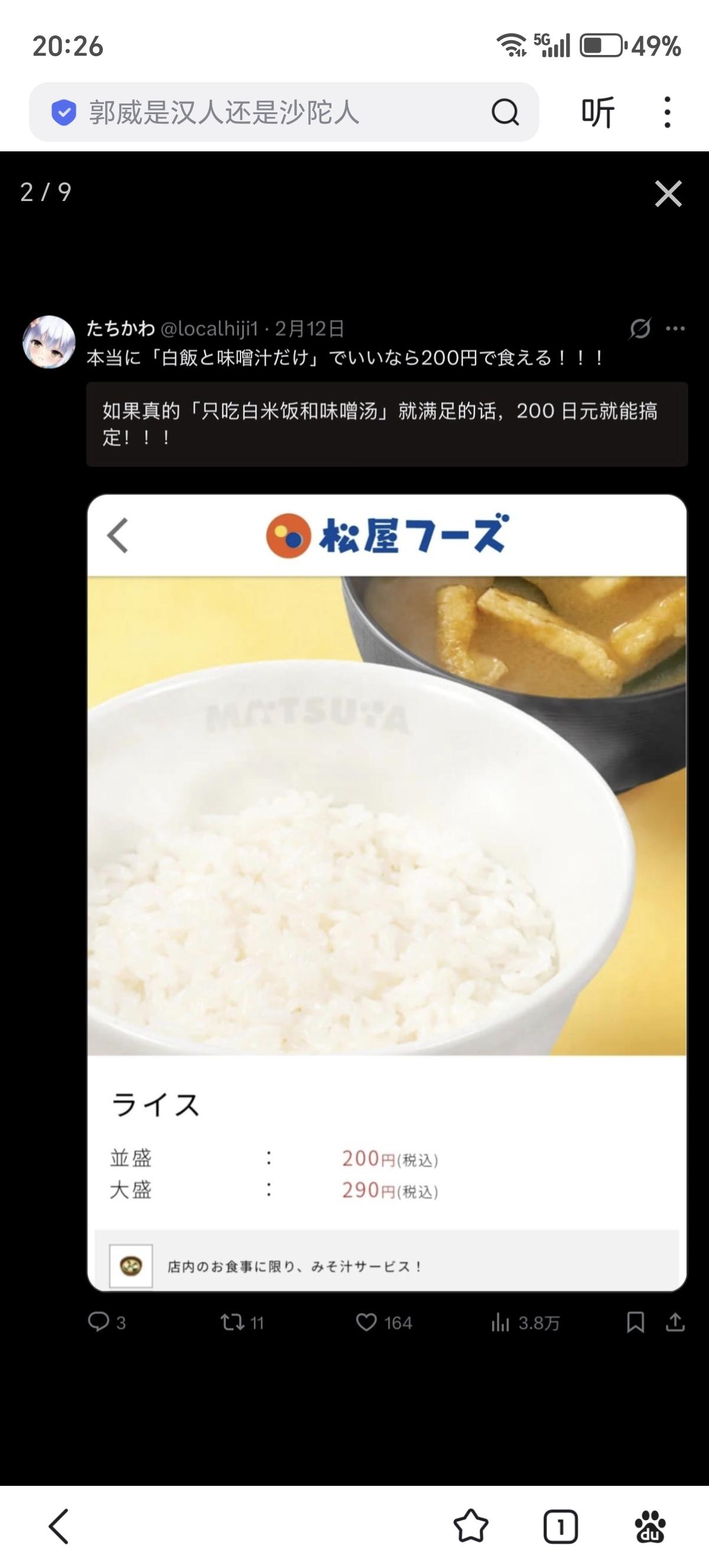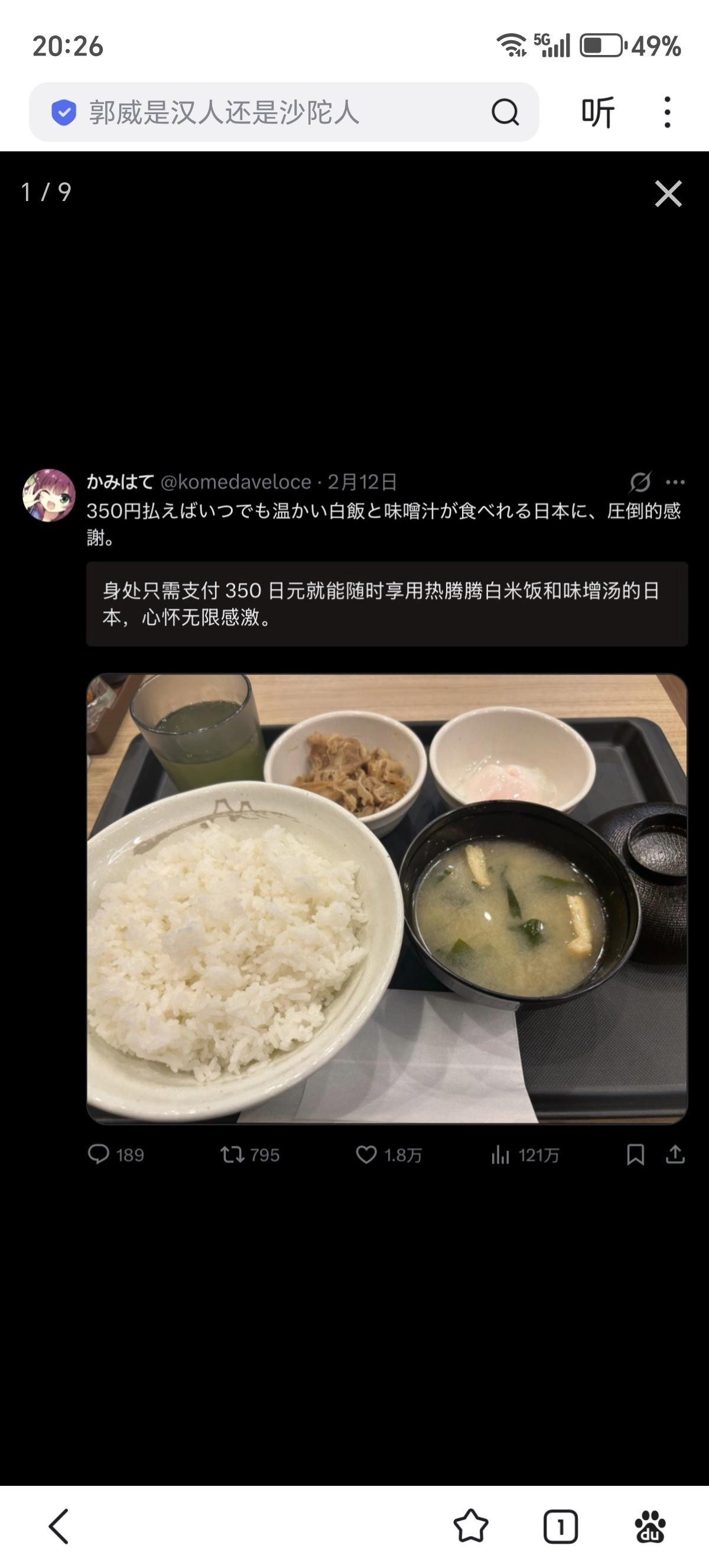 十六块钱就吃一碗白米饭,一小碗热水冲的味精紫菜汤,一口咸菜,一个水煮蛋。 非常感恩。 怪不得日本人嫌弃米价不够高呢。