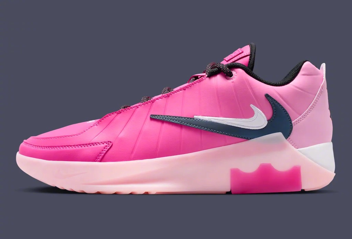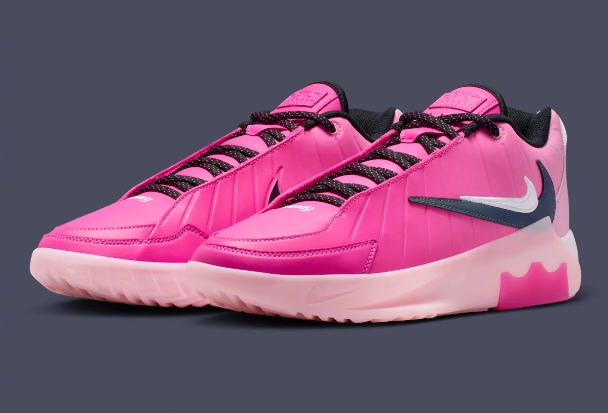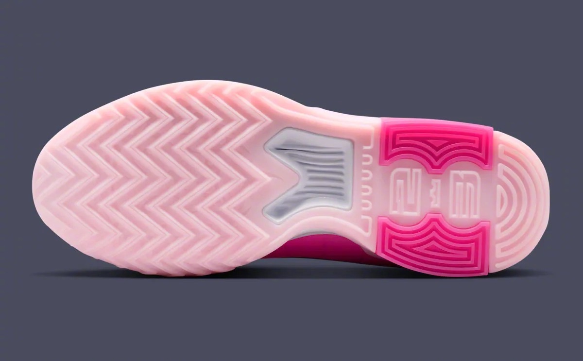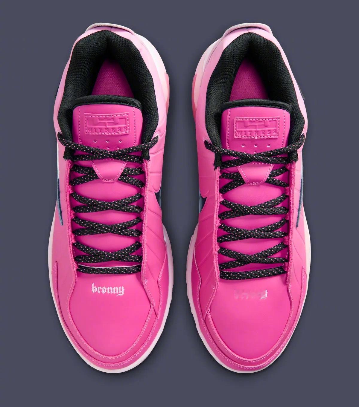 詹姆斯Witness 9「布朗尼」专属配色官图,也是布朗尼的首款专属市售配色,粉色鞋身搭配白色和黑色双SWOOSH,鞋头和后跟均绣有哥特样式的「bronny」和布朗尼的个人LOGO👑