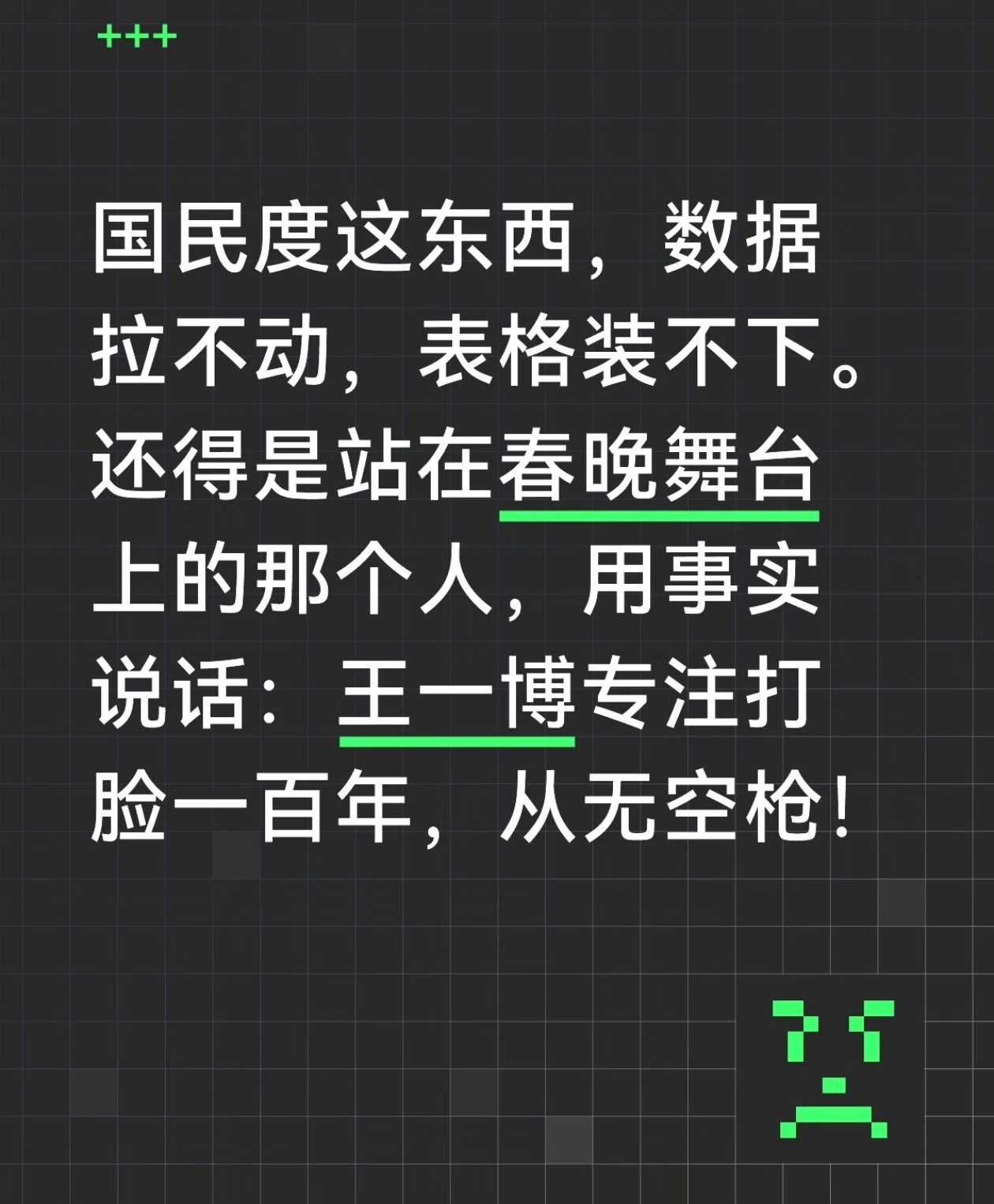 国民度这东西,数据拉不动,表格装不下。还得是站在春晚舞台上的那个人,用事实说话:王一博专注打脸一百年,从无空枪!