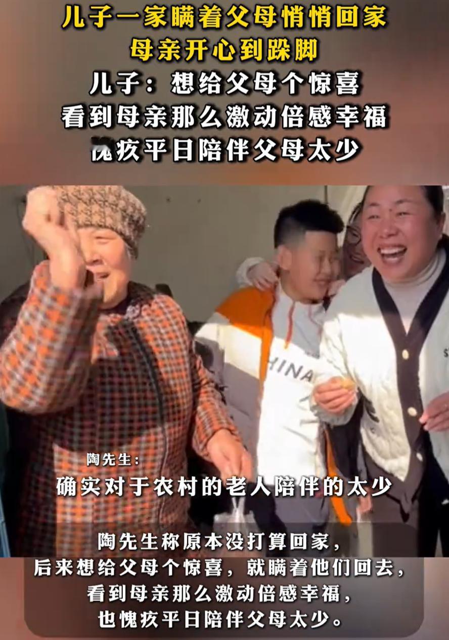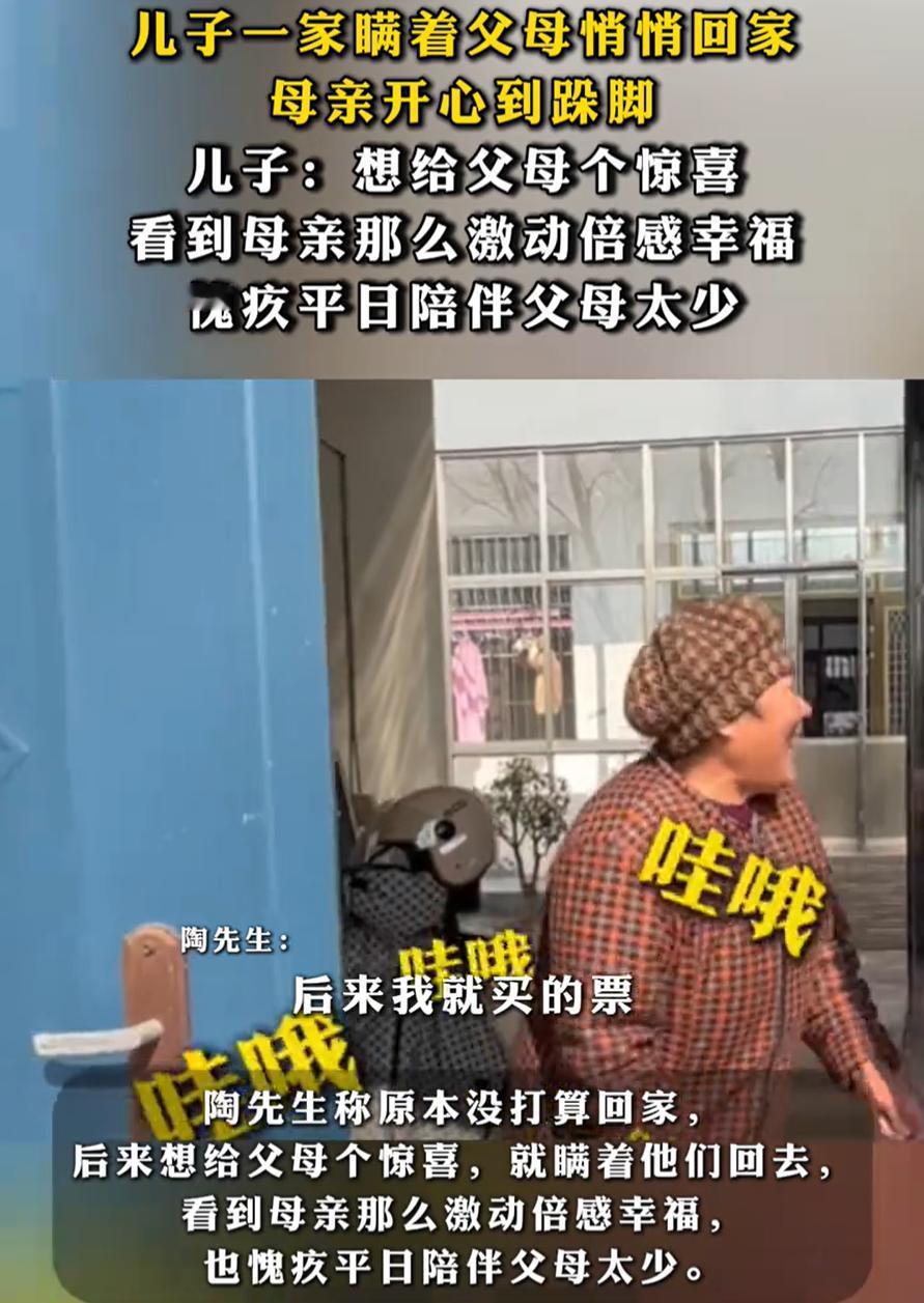 这惊喜来的太大了!江苏连云港,男子一家三口瞒着父母悄悄回老家过年,当孙子敲门喊出“奶奶”的时候,老人开心的原地跺脚,而男子看到母亲的反应,也是相当的愧疚。网友:以后提前说! 陶先生一家三口在黑龙江生活工作,因为距离太远,本来今年没有回家过年的打算,一天吃饭时聊到此事,老婆突然说了句:老两口年纪大了,还是回去看看吧 于是陶先生临时决定回家过年,但他并没有告诉父母,想着给他们一个惊喜,而母亲也确实惊喜,看到儿子、孙子回家过年,站在门口原地跺脚,脸上满是喜悦之情,却说不出什么话来 陶先生说,对于农村老人来说陪伴确实太少了,看他们激动的反应自己很感动,同时也很愧疚平时陪伴的太少了 这事在网上传开后,评论区基本都在说一个意思:以后还是提前告诉老人吧 有人说得特别实在,你要回去,提前一个月告诉父母,他们能高兴一个月,天天数着日子盼你回来。这盼的过程,其实也是幸福的一部分 我觉得这话说的是有道理的,惊喜这事,得分人分场合。年轻人喜欢惊喜,觉得突然出现特有仪式感。可对上了年纪的父母来说,尤其是那些一年到头见不着孩子几回的老人,他们更需要的可能不是那一瞬间的惊喜,而是能提前几天、几周,慢慢消化孩子要回来这个好消息 你想啊,老人知道你要回来了,能提前准备你爱吃的菜,能把被子拿出来晒晒太阳,能跟邻居显摆显摆我儿子闺女要回来了。这种期待的过程,本身就是一种幸福 再说了,老人年纪大了,心脏也经不起太突然的刺激。视频里那个奶奶高兴得直跺脚说不出话,看着是开心,可万一激动过头了呢? 回家过年,还是提前说一声好。让父母多高兴几天,也让他们的期待有个着落。别把惊喜搞成了惊吓,也别让父母只能在那一瞬间感受快乐