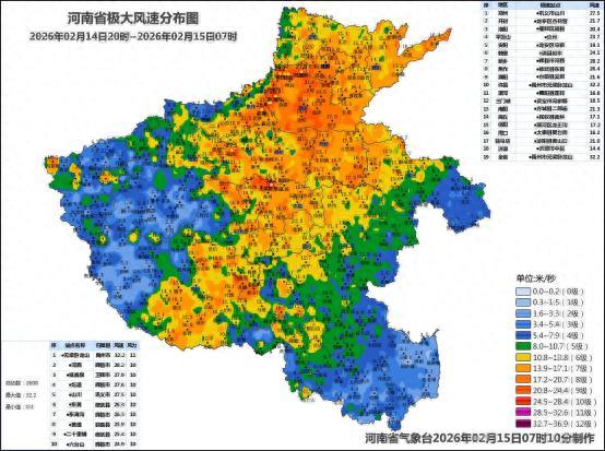 大河网讯(记者莫韶华)2月15日,据河南省气象台监测数据显示,2月14日20时至15日7时,我省北中部、西南部出现6到8级大风,局地9到11级。风速前三站分别为:禹州市无梁卧龙山32.2米/秒(11级)、辉县市河西28.2米/秒(10级)、卫辉市抵鹿泉27.9米/秒(10级)。