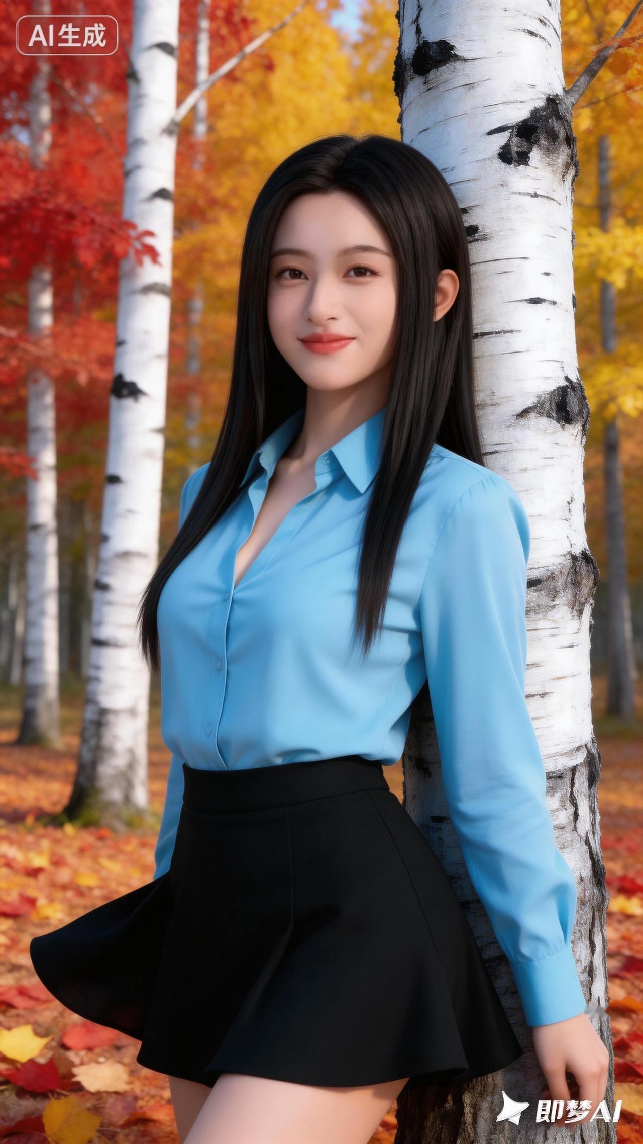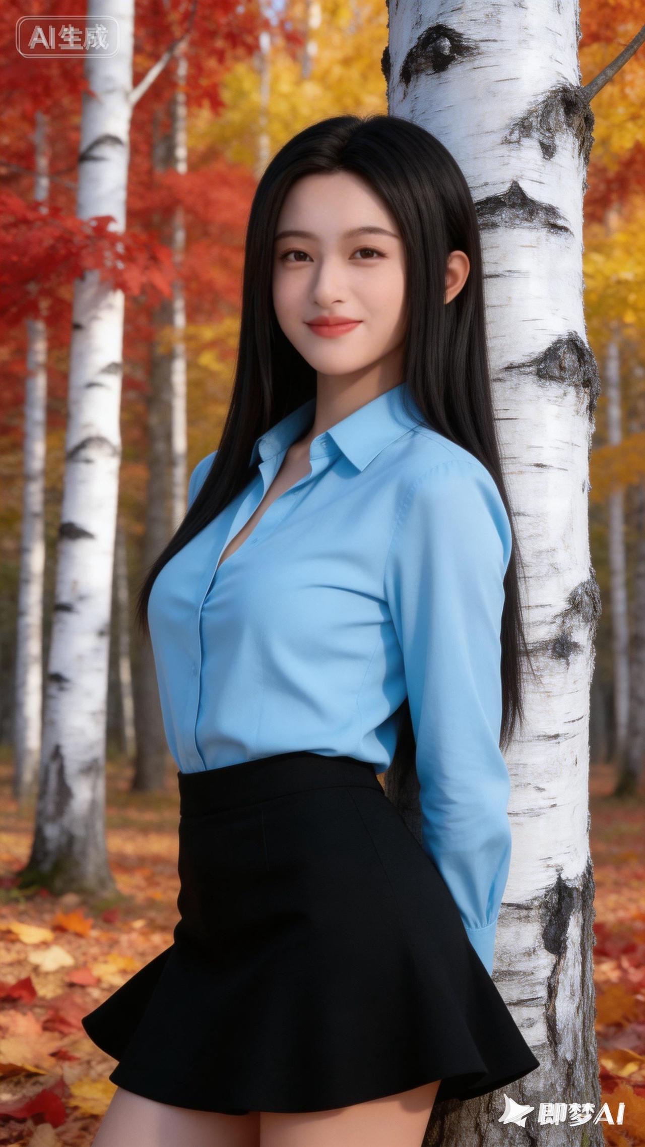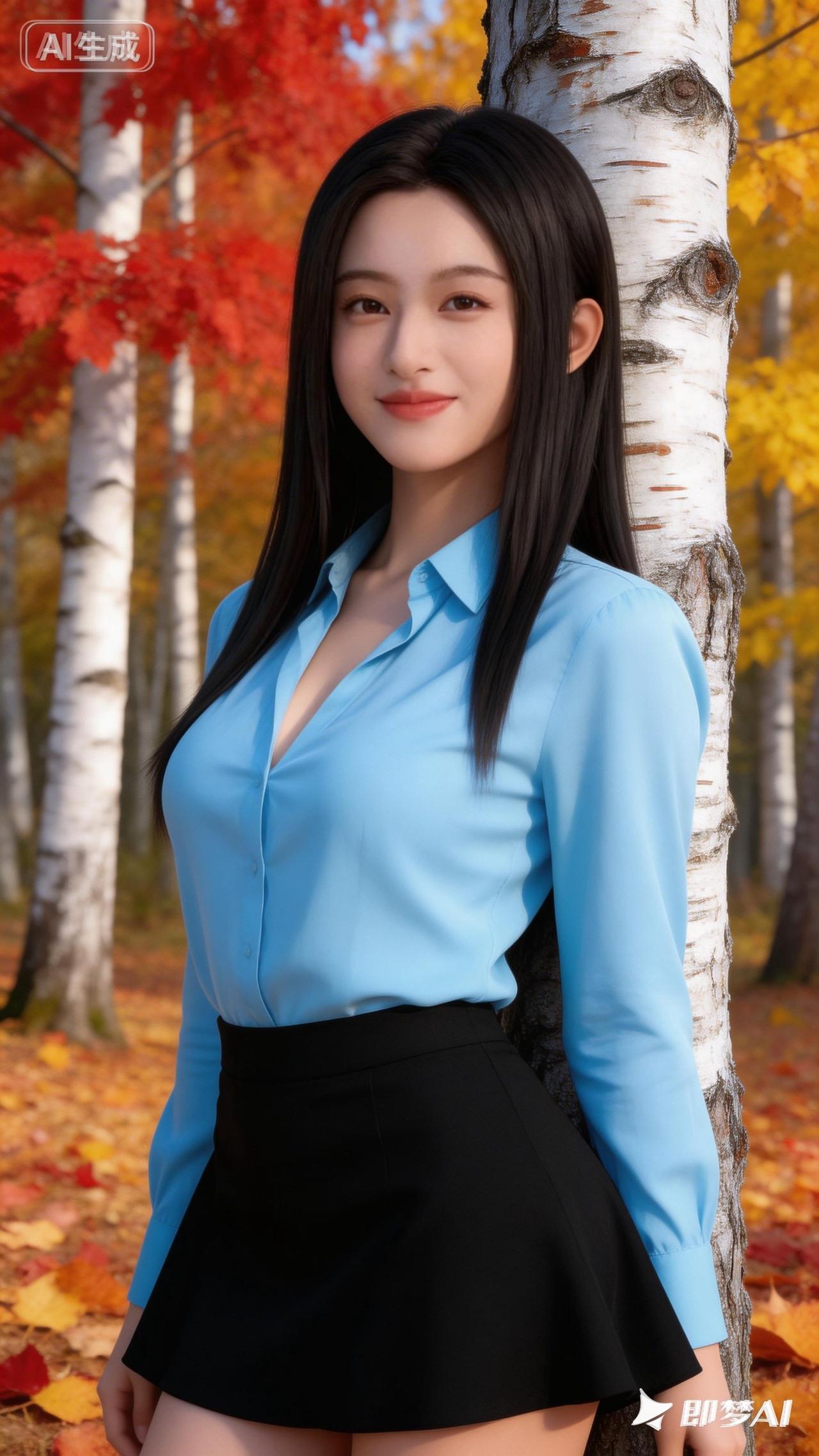 秋日森林中的甜美少女,蓝色衬衫与黑色短裙的完美搭配,尽显优雅与时尚。