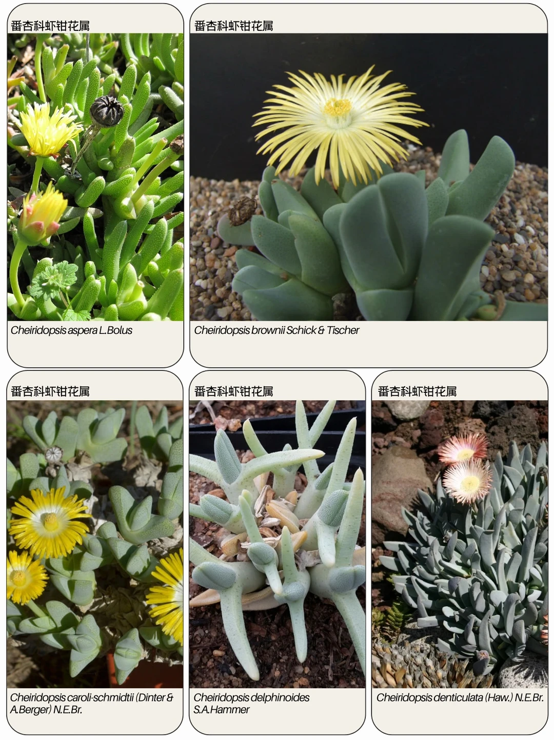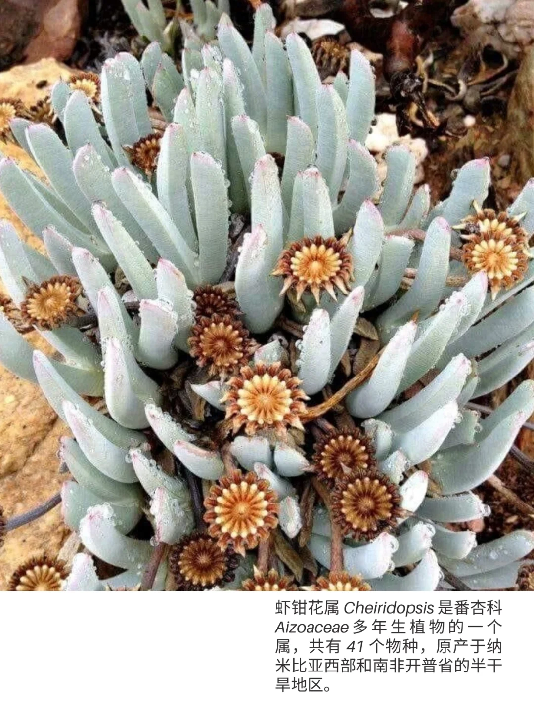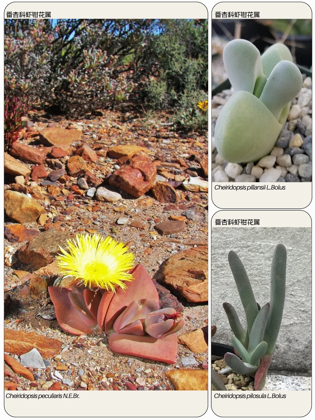 虾钳花属 Cheiridopsis 是番杏科Aizoaceae多年生植物的一个属,共有 41 个物种,原产于纳米比亚西部和南非开普省的半干旱地区。