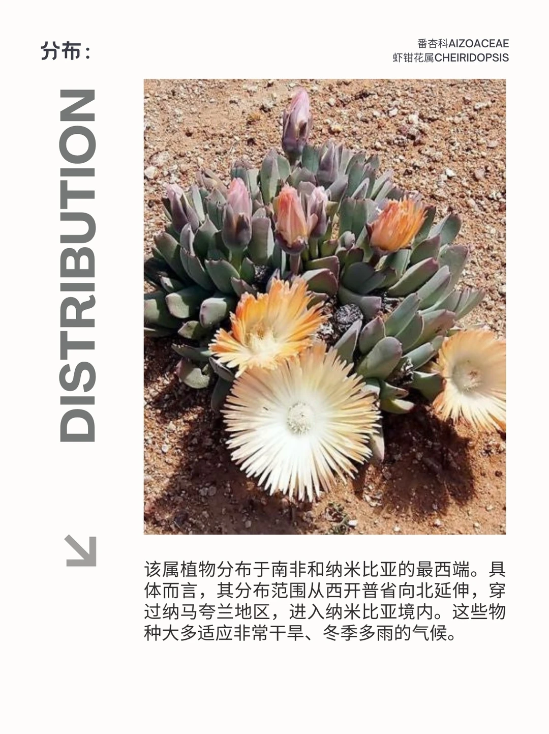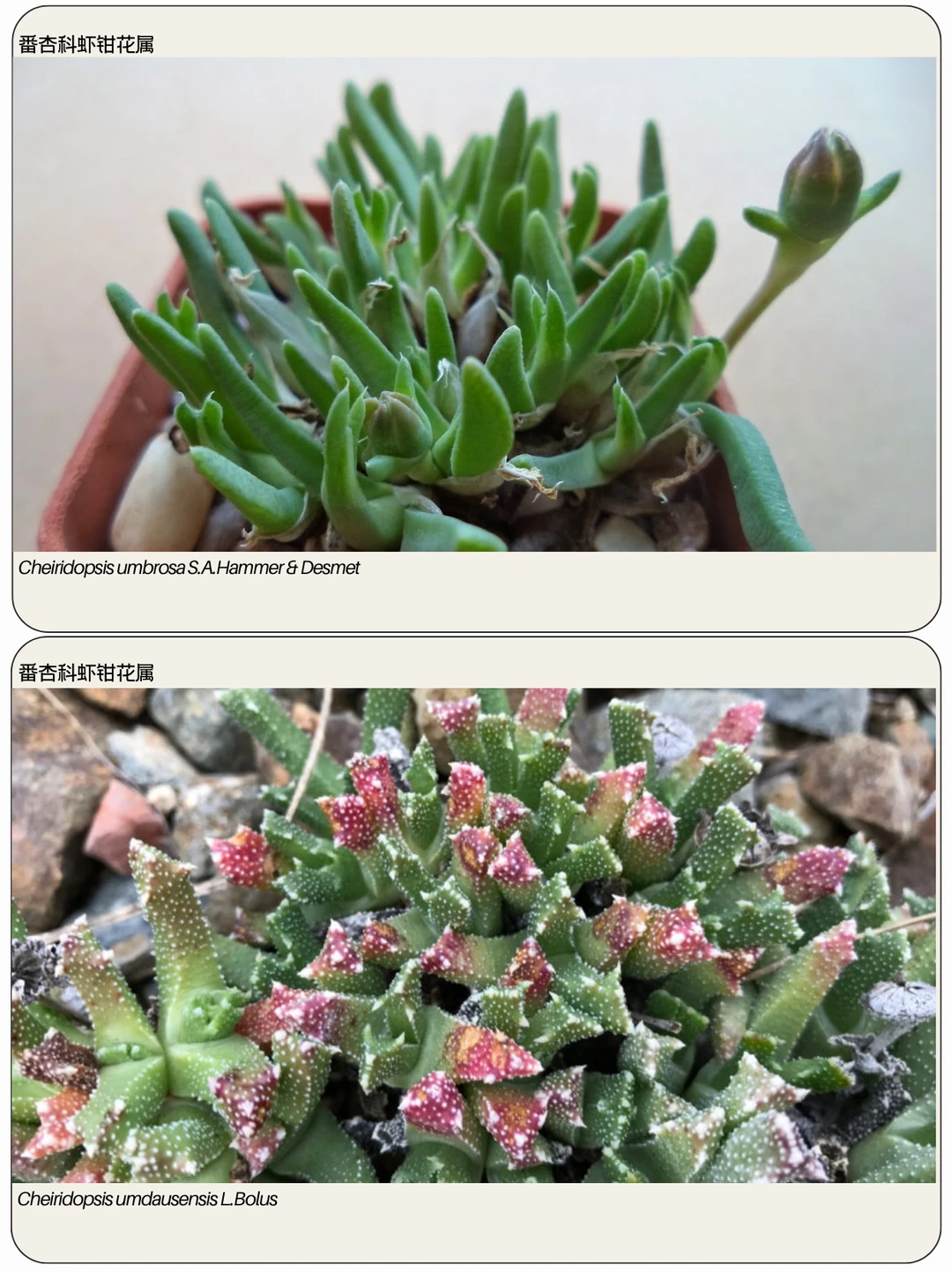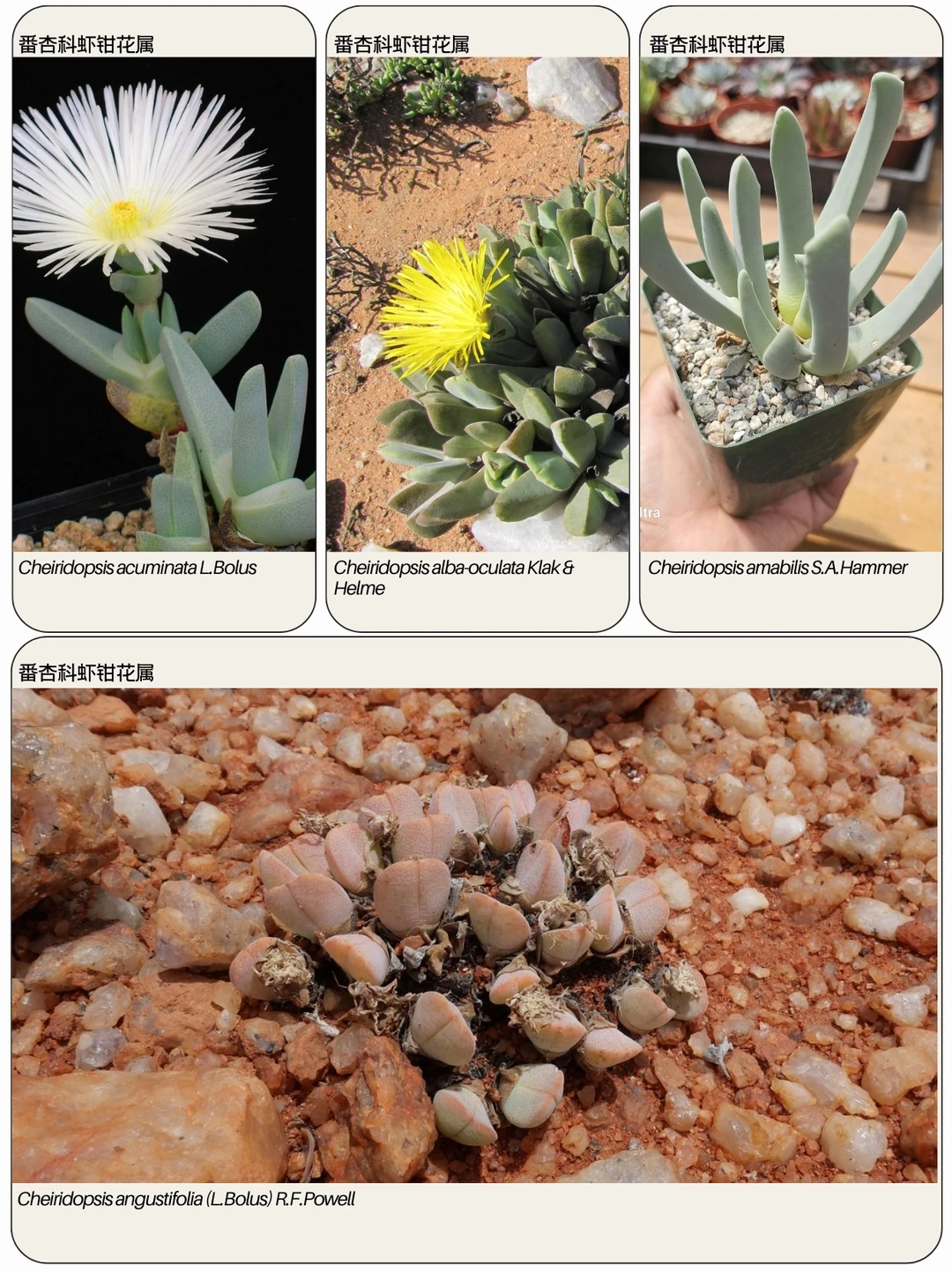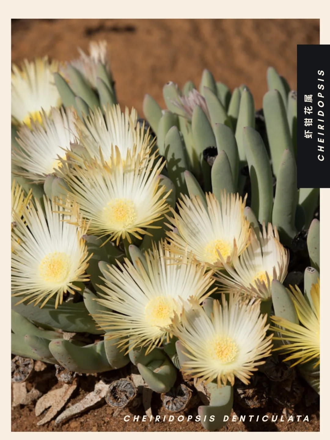 虾钳花属 Cheiridopsis 是番杏科Aizoaceae多年生植物的一个属,共有 41 个物种,原产于纳米比亚西部和南非开普省的半干旱地区。