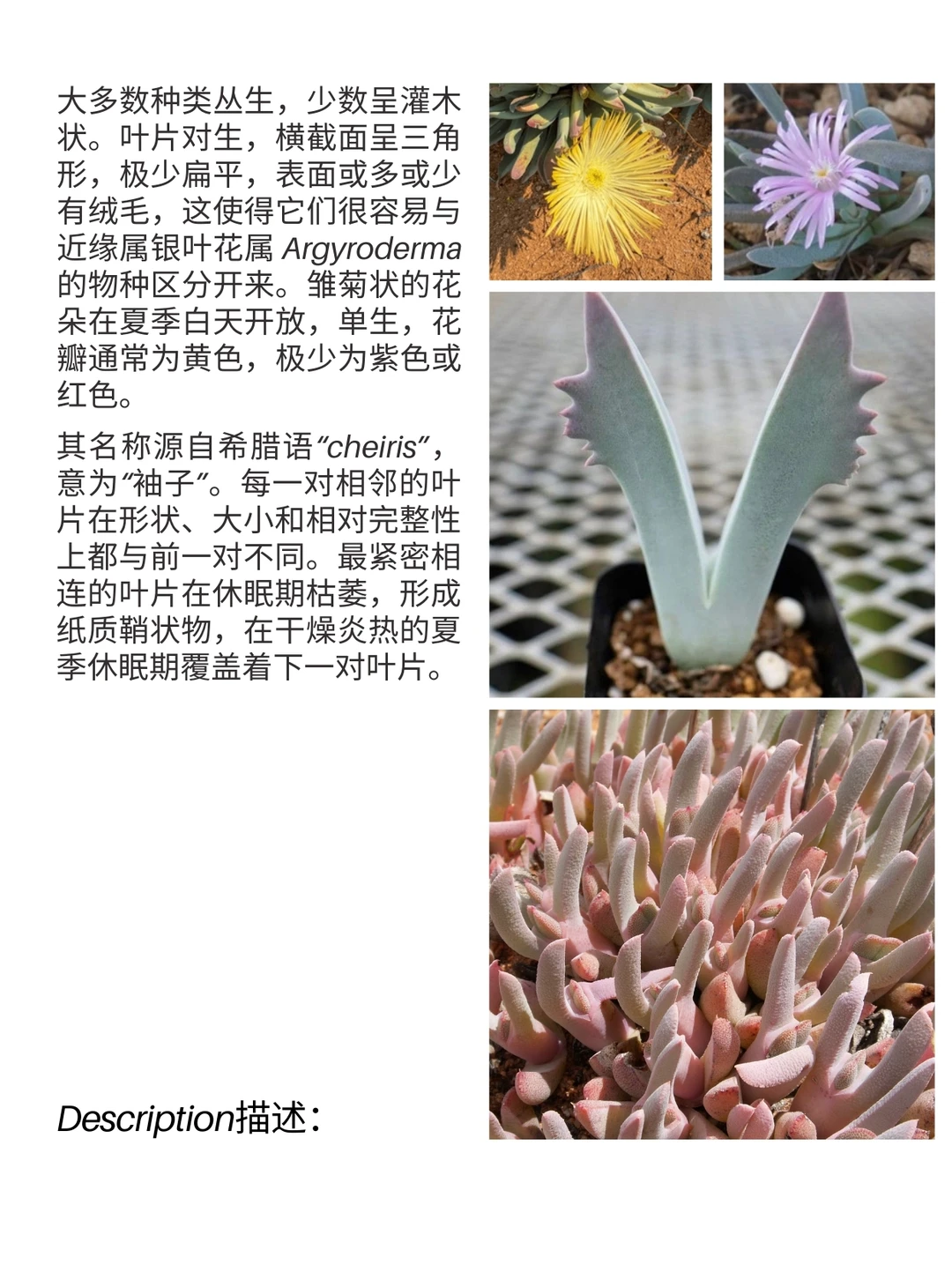 其名称源自希腊语“cheiris”,意为“袖子”。每一对相邻的叶片在形状、大小和相对完整性上都与前一对不同。最紧密相连的叶片在休眠期枯萎,形成纸质鞘状物,在干燥炎热的夏季休眠期覆盖着下一对叶片。