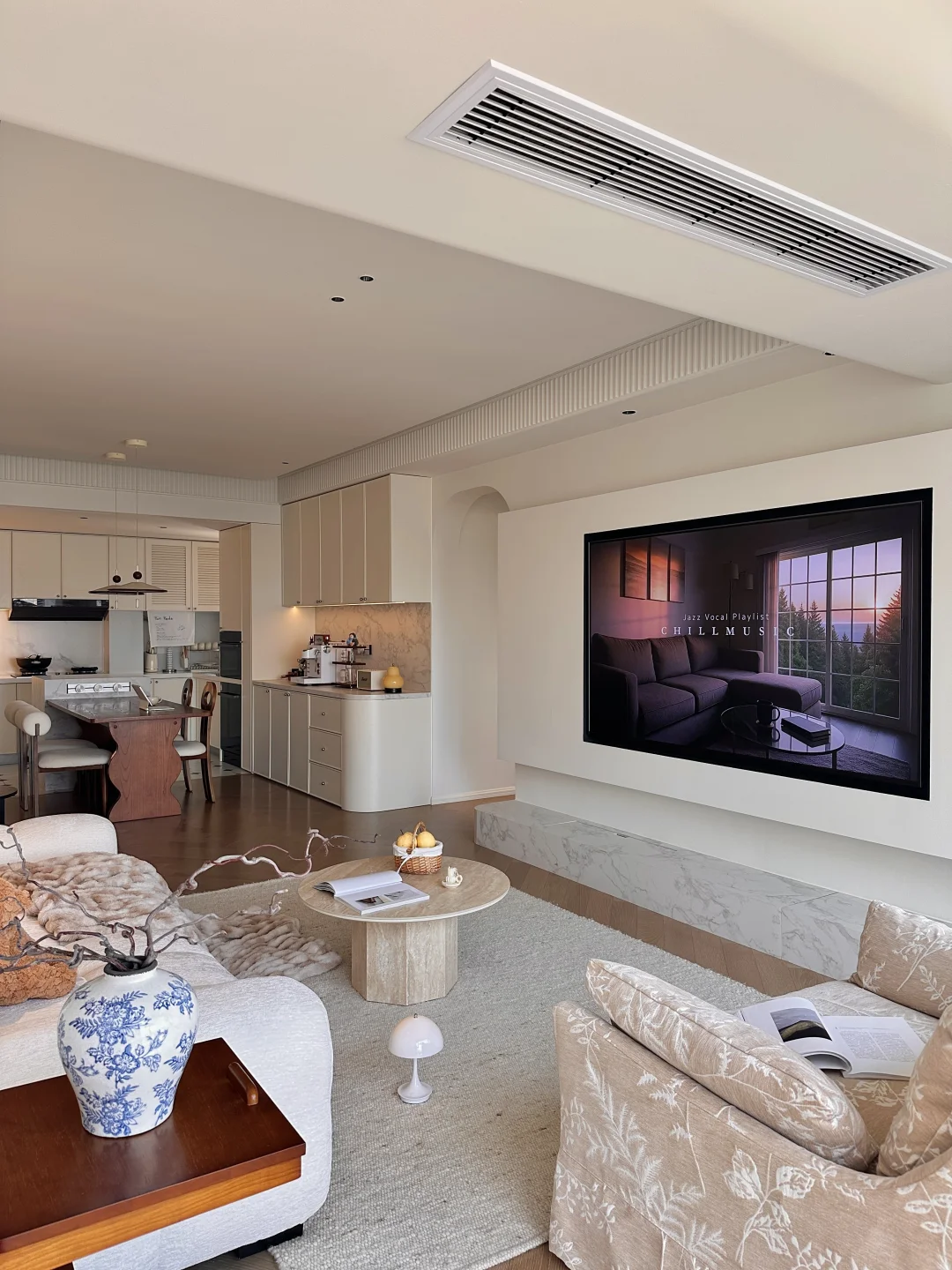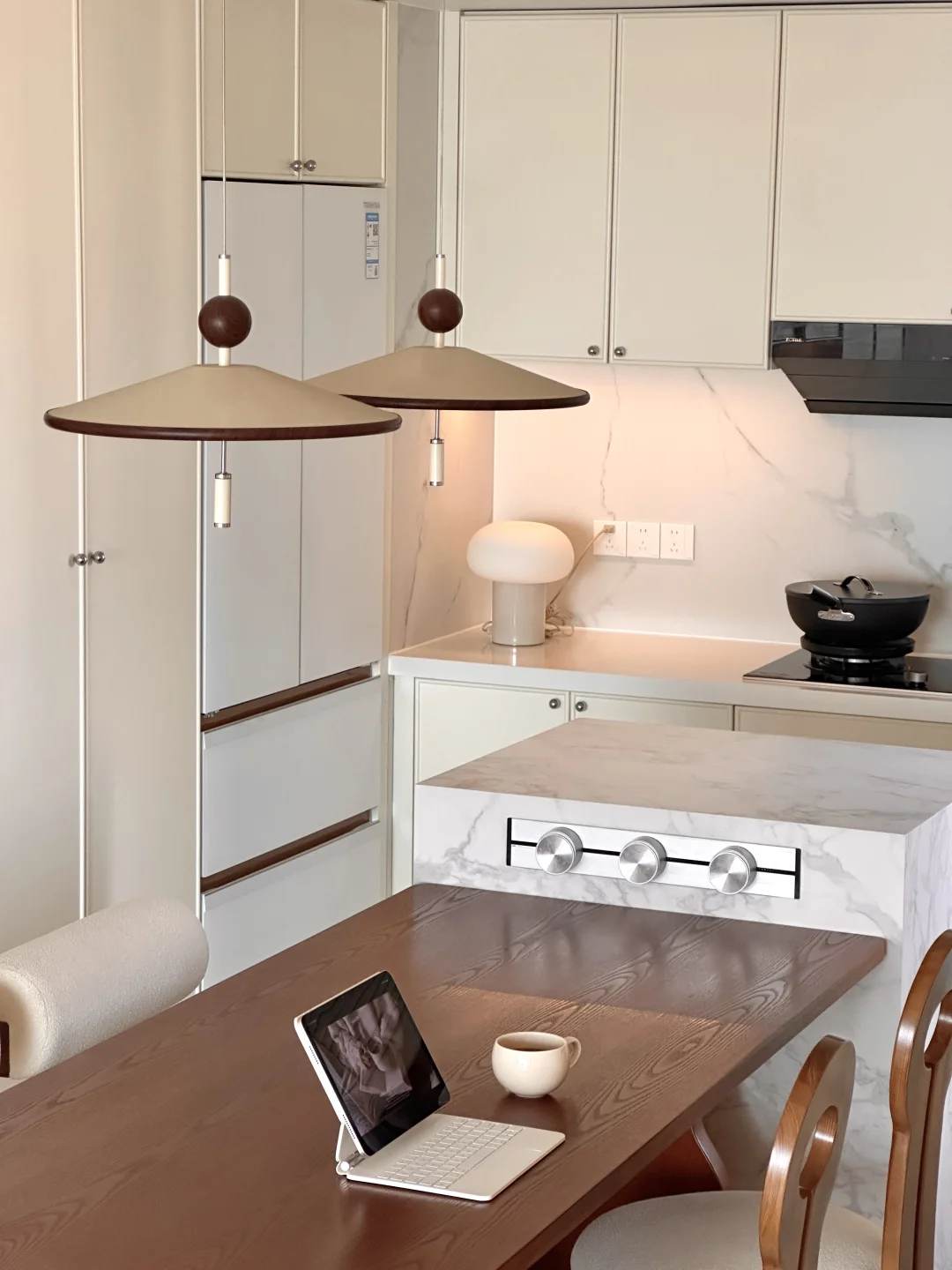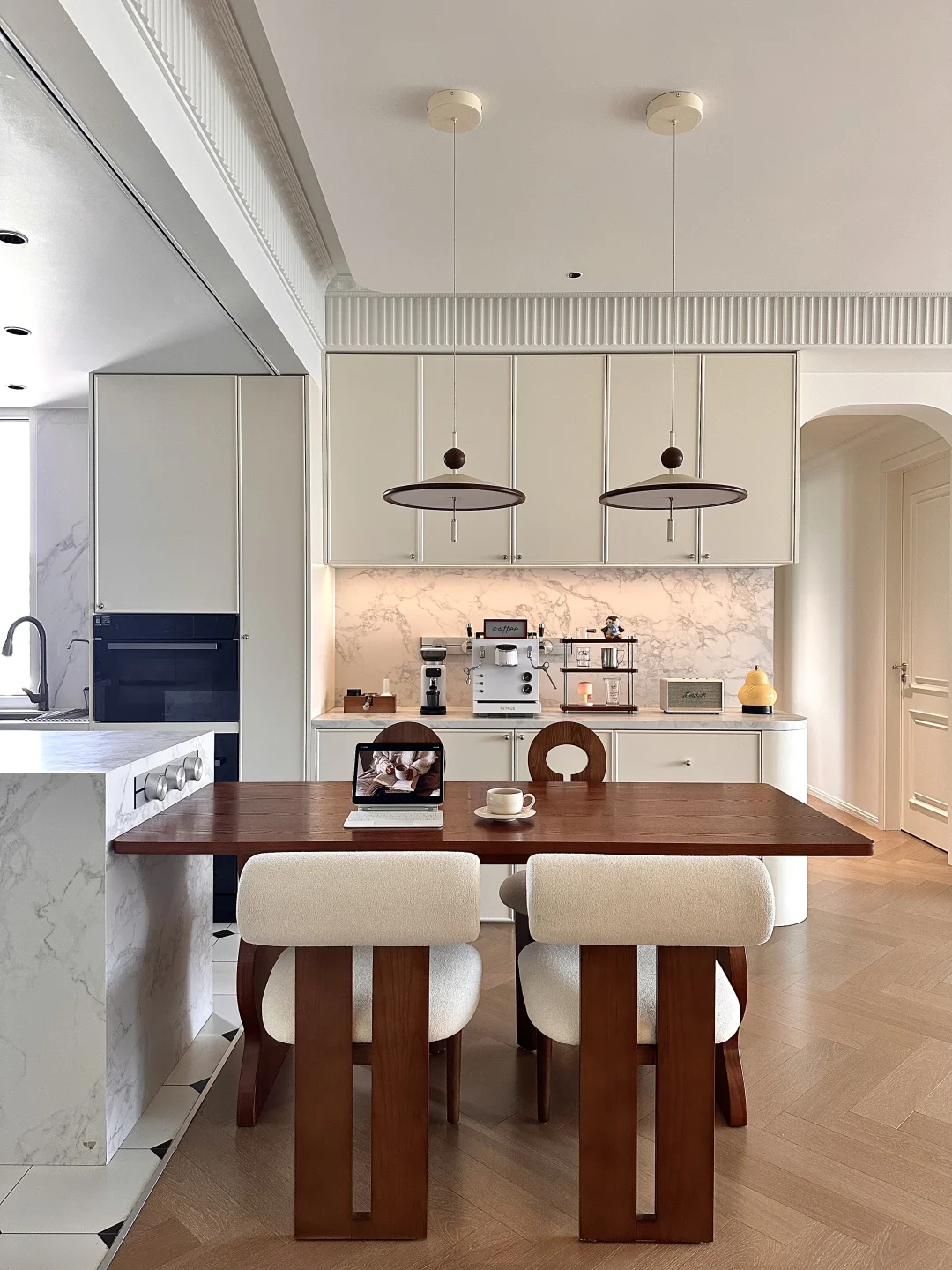 . 关于我家 建面119套内92平~ 自己设计装修的房子,真的越住越爱 打通厨房和餐厅做成了开放式的格局 整个空间都变得更开阔了 硬装简简单单通刷白色乳胶漆 无主灯设计,通铺木地板 . 每一个角落都布置成自己喜欢的样子 餐边柜做60cm深可以放日常小家电 客厅白色沙发搭配羊毛地毯松弛感满满 餐厅用1.8米的木纹餐桌用餐和办公都很合适 我想普通人的家,没什么特定的风格 耐看,温馨,舒适就够了~
