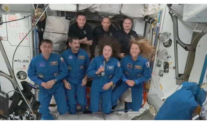 大约两个小时后舱门打开,四名宇航员成功登上国际空间站,并与留在空间站的三名宇航员击掌庆祝,Meir说道:“让我们开始吧”。