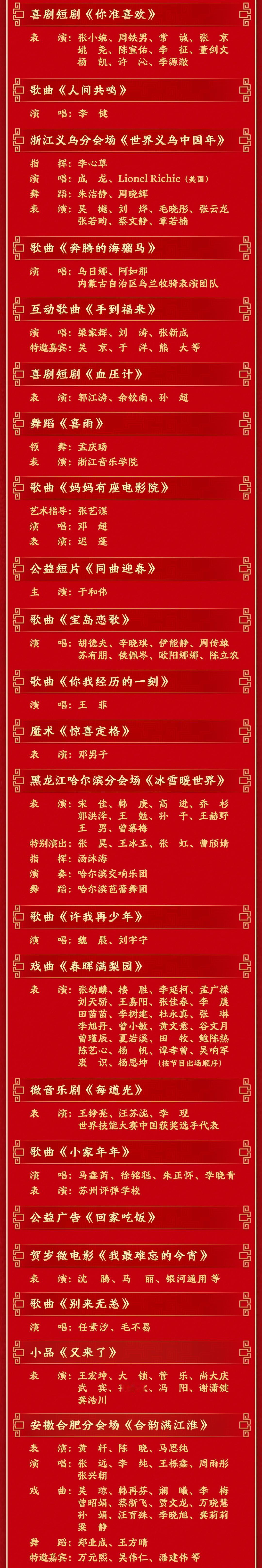 春晚最新节目单,我最期待的是小品和魔术节目,小品期待的是赵本山,魔术期待的是刘谦,但没有他们俩。 很多人都是怀旧的,特别是上了岁数的人,美好的记忆在头脑中不会轻易被磨灭,这并不是固执和守旧,这是我们的专一和专情。 这个节目单当中,我感兴趣的是武术节目,并不是我对武术感兴趣,而是对宇树科技的机器人感兴趣,我喜欢看科技的进步,我们的老年生活将会受益于这些科技的进步,我们将来生活的方方面面都会受益于这样的科技进步。 祝我们伟大的祖国繁荣富强,祝福我们中华民族早日实现伟大复兴,繁荣和复兴的根本就是我们的科技进步。