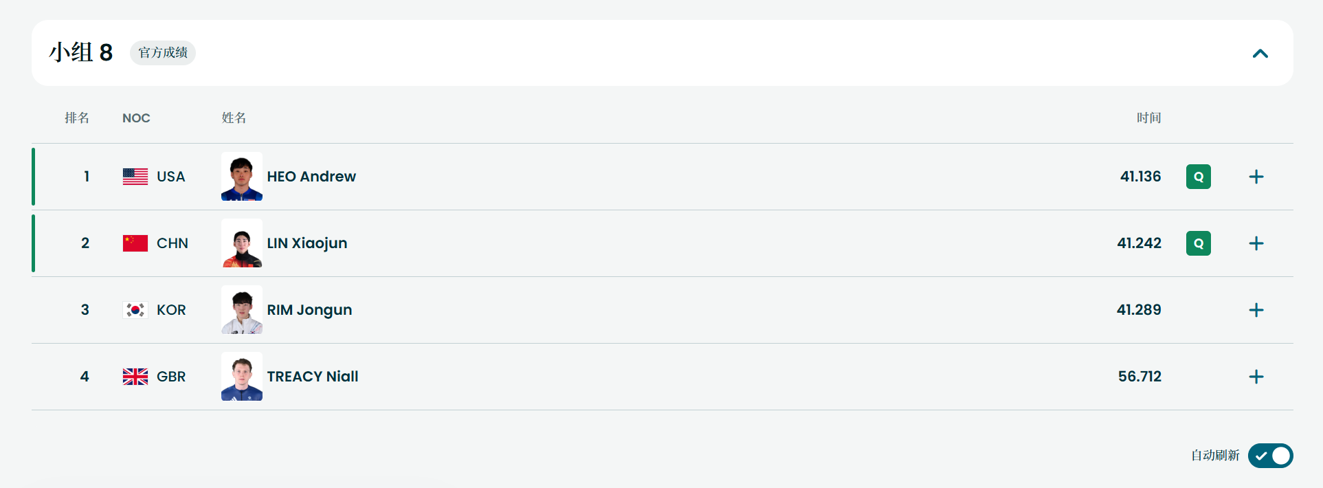 林孝埈第八组出发,滑出41.242,小组第二晋级1/4决赛。