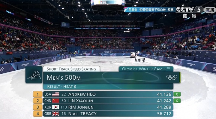 刘少昂在第4组出场,以小组第一的成绩晋级,同组的韩国选手黄大宪小组第三被淘汰。随后第5组的孙龙因犯规被判成绩无效,无缘1/4决赛。林孝埈最后一组出场,小组第二同样出线。