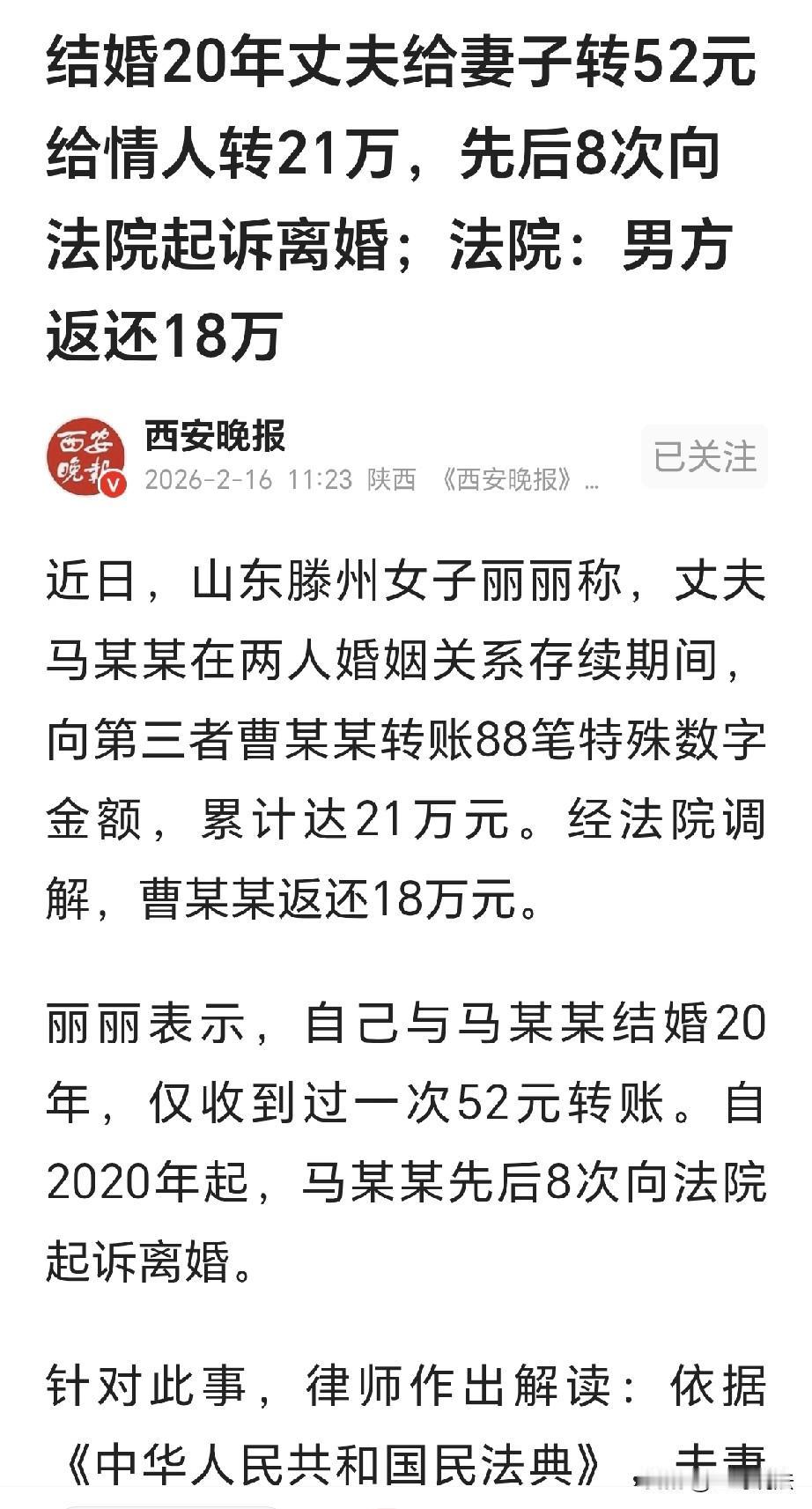 山东滕州,一女子发现,丈夫给小三转款88次,合计21万,转款全是特殊数字,有520,有1314,女子嚎啕大哭,她和丈夫结婚20年,丈夫只给她转过一次52元,谁知丈夫看她发现,把心一横就跑到法院,丈夫8次上诉离婚,女子不离,就不让他如愿,女子将小三告到法院,要小三返还21万,结果令人意外! 丽丽年轻的时候,义无反顾的嫁给了马某,转眼之间,20年匆匆过去。 他们从青春年少,相扶相伴,经历了无数的风雨,如今已经步入了中年。 最初的时候,二人情深意切,他们夫妻同心,一起打拼,没过多久,就有了自己的房子。 此后,丽丽生儿育女,辛辛苦苦操持着家庭,她一度认为,自己的婚姻牢不可破。 可是她没有想到,20年后,一切都破灭了,她曾经守护的感情,却被马某亲手毁坏。 原来,丽丽不经意的发现,马某最近行为奇怪。他接打电话,再也不像从前,从前他从不避开,从从容容。 可是现在,他躲躲藏藏,总是想尽了办法,要躲开丽丽。 丽丽奇怪,逐渐有了不好的感觉,她偷偷观察,发现马某只要一接电话,就是很长很长的通话时间。 他躲在阳台,或者躲在卫生间,他一边聊着,一边笑着,话里话外,都热情非凡,好像电话那头,才是他最爱的人。 丽丽不知道的是,马某早就有了别人,他和曹某偷偷来往,已经有很长很长的一段时间。 他每天回来,早就看着丽丽不顺眼,可丽丽没错,他没有借口离开丽丽。 他觉得曹某温柔,哪里都比丽丽更上一筹,她年轻美丽,而丽丽已经是黄脸婆一个。 马某恍惚之间,仿佛回到了从前那个少年,只是他的深情,再也不是用在丽丽身上。 他把手机换了密码,再也不让丽丽随便翻看,丽丽心里虽然疑惑,但她不相信马某能够背叛家庭。 可万万没有想到,偶然一个机会,丽丽看到了马某的转账记录,那一瞬间,天都塌了。 记录里显示,马某向女子曹某转账88笔,全是特殊金额,有520,有1314。 丽丽眼前发黑,几乎就要昏厥过去,她呼吸加快,心里跳的像小鹿一样。 她平静了一会儿,拿个计算机一算,马某给曹某的转款,合计21万。 丽丽不敢相信,这些充满特殊意义的数字,本该是属于夫妻之间的浪漫。 可如今的马某,却把这份浪漫,悄悄给了别的女人。 丽丽又气又怒,想起来自己陪伴他20多年,陪他受苦受穷,陪他吃尽了苦头。 可是,他们的感觉已经变了味道,昔日的恩爱早就不复存在,她这才明白,马某对她敷衍了事,就连看她的眼神都变得很不耐烦。 丽丽质问马某,这事到底是怎么回事? 马某看她发现,欺负她老实,把心一横,丝毫没有隐瞒,他告诉丽丽,我就是有了别人,你爱咋咋地,反正我不爱你! 二十年的夫妻情分,在这一刻变成了笑话,丽丽声嘶力竭,对着马某就开始算账。 你我结婚20年之久,你只给我转账一次,这一次转账,也只有52元。 我付出了所有,没有功劳也有苦劳,却还不如你半路结识的女人!你良心何在? 马某无动于衷,既然这事你已发现,我不妨挑明了说,我早就不想再回来了。 马某把脸一变,这个婚姻他不要了,他从2020年开始,先后8次起诉离婚。 丽丽伤心欲绝,她心如刀割,我就不离,凭啥我打下来的江山就要如此拱手让人? 更何况是你马某背叛,你不但背叛家庭,还把我们夫妻共同财产给了别的女人! 丽丽一气之下,将曹某告上了法庭,要求她返还21万! 《民法典》第1062条规定: 夫妻在婚姻关系存续期间所得的工资、奖金、劳务报酬等财产,为夫妻的共同财产,归夫妻共同所有,夫妻对共同财产有平等的处理权。 也就是说,因日常生活需要处理共同财产的,任一方可以自主决定。 但非因日常生活需要对共同财产做重要处理决定,需夫妻双方平等协商一致。 马某转给曹某的21万元属于婚内共同财产,转账行为并非用于家庭日常生活,而是基于婚外情的赠与,已经超出了日常家事代理范围,因此马某无权单独处分。 马某的行为侵 犯了丽丽对共同财产的平等处分权,违背了夫妻忠实义务。 因此法院认定,马某对曹某的赠与无效,支持丽丽追回财产。 《民法典》第153条规定: 违背公序良俗的民事法律行为无效。 《最高院关于适用民法典婚姻家庭编的解释(二)》第七条规定,夫妻一方因违反夫妻忠实义务,将共同财产赠与他人,另一方主张该行为违背公序良俗无效的,法院应予支持。 马某向曹某转账特殊金额,本质上是为了维系不正当关系的赠与,严重违反公序良俗。 因此,法院认为,该赠与无效,曹某取得财产缺乏合法依据,属于不当得利,理应返还。 经法院调解,曹某返还丽丽18万元。 对此,你怎么看?