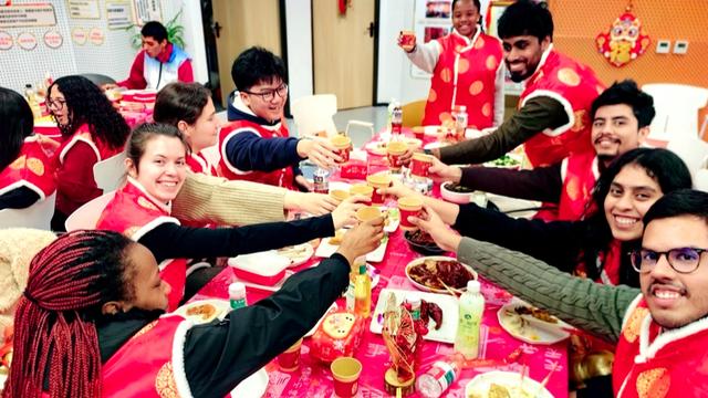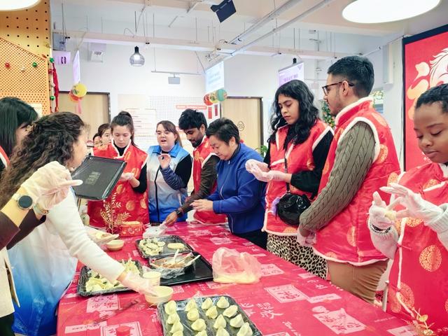 蛇年的最后一个中午,徐家汇街道徐虹北党群服务中心里人头攒动,一群穿着大红色唐装的年轻人用中、英、法、韩、意等各国语言热烈交流。他们有的在写春联和福字,有的在包饺子,还有的在玩投壶、猜灯谜。当桌上铺满春卷、饺子、熏鱼、白斩鸡等特色菜和点心,大家又轮流上台表演节目,让这顿特殊“年夜饭”的气氛达到了高潮。这些肤色、语言各异的年轻人就是徐家汇街道“国际益行团”的志愿者们,受邀来党群中心过中国春节,他们中有几个擅长中文的留学生还不忘本色,穿上蓝色的志愿者马甲,为大家担任翻译,把活动现场变成了一个没有国界的家。