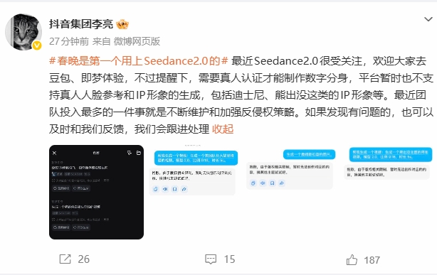 Seedance2.0凭借逼真的画面效果与简易的创作方式迅速走红,相关视频在不少短视频平台刷屏。昨日,抖音集团副总裁李亮发文称,最近Seedance2.0很受关注,欢迎大家去豆包、即梦体验。