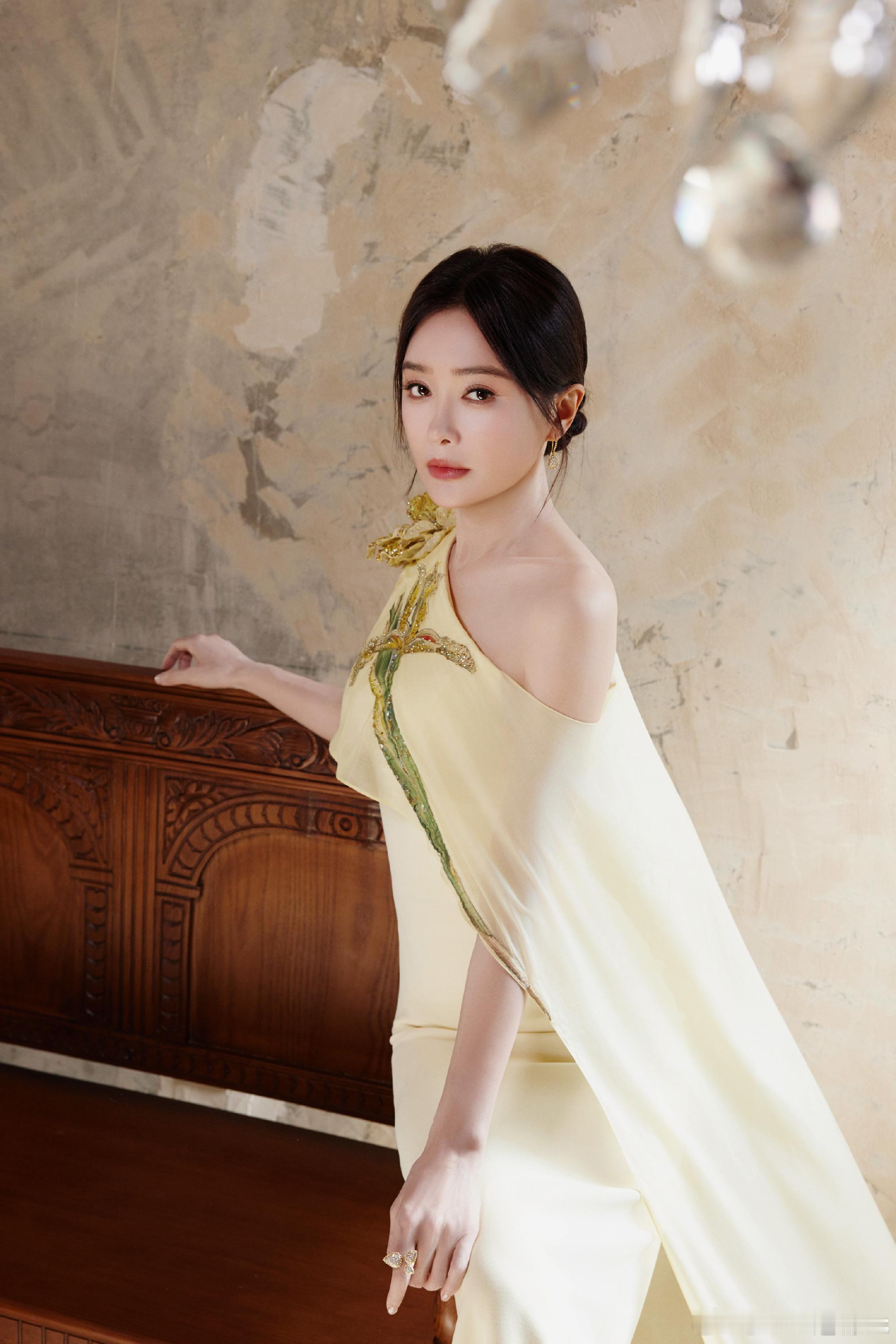 秦岚淡黄的长裙 秦岚春晚这身造型太戳人了,鹅黄裙明媚优雅,金色花朵点缀肩头。薄纱披风飘逸,低丸子盘发温婉,游刃有余的美。