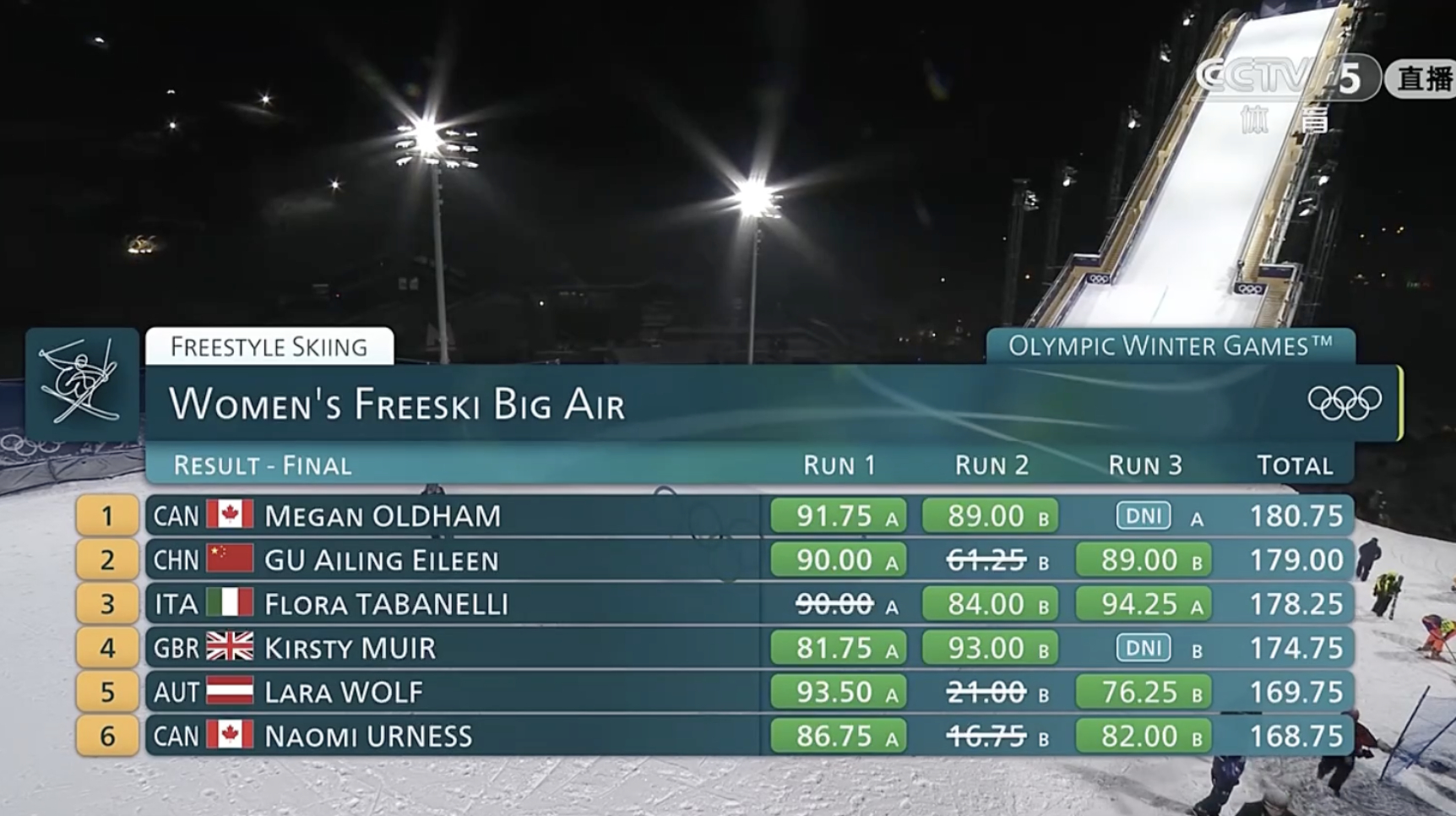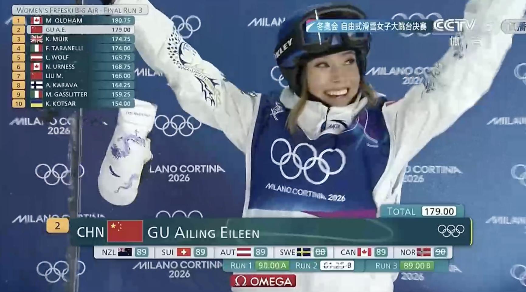 女子自由式滑雪大跳台决赛 谷爱凌第三跳89分,总分179分!最终获得银牌🥈
