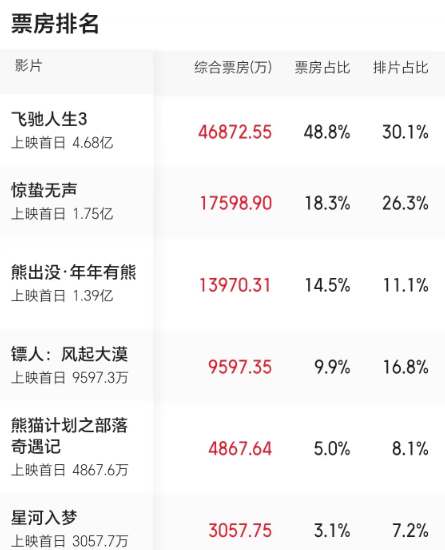 截至发稿,《飞驰人生3》票房近4.7亿,暂列春节档票房榜首位。《惊蛰无声》《熊出没·年年有熊》分列二三位。