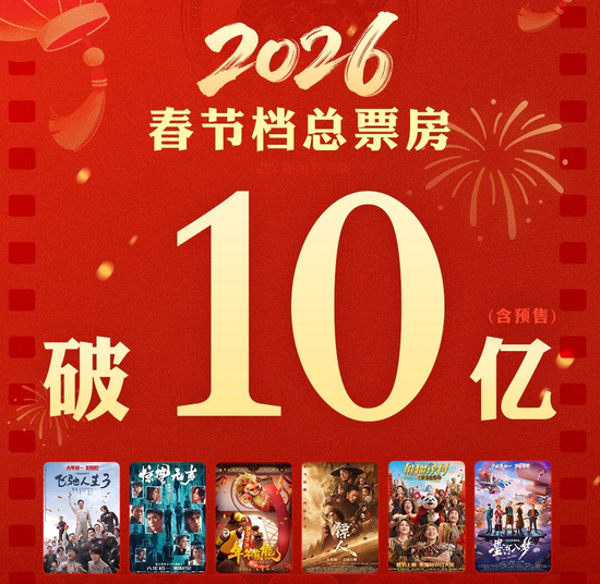 据猫眼专业版数据,2月17日,2026年春节档档期总票房(含预售)已破10亿。同时,2026年大年初一单日场次超56.9万,刷新影史大年初一单日场次纪录。